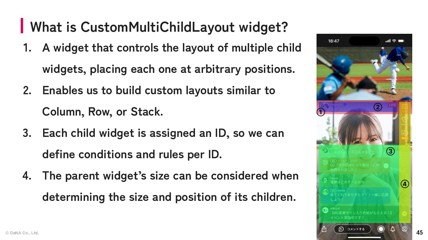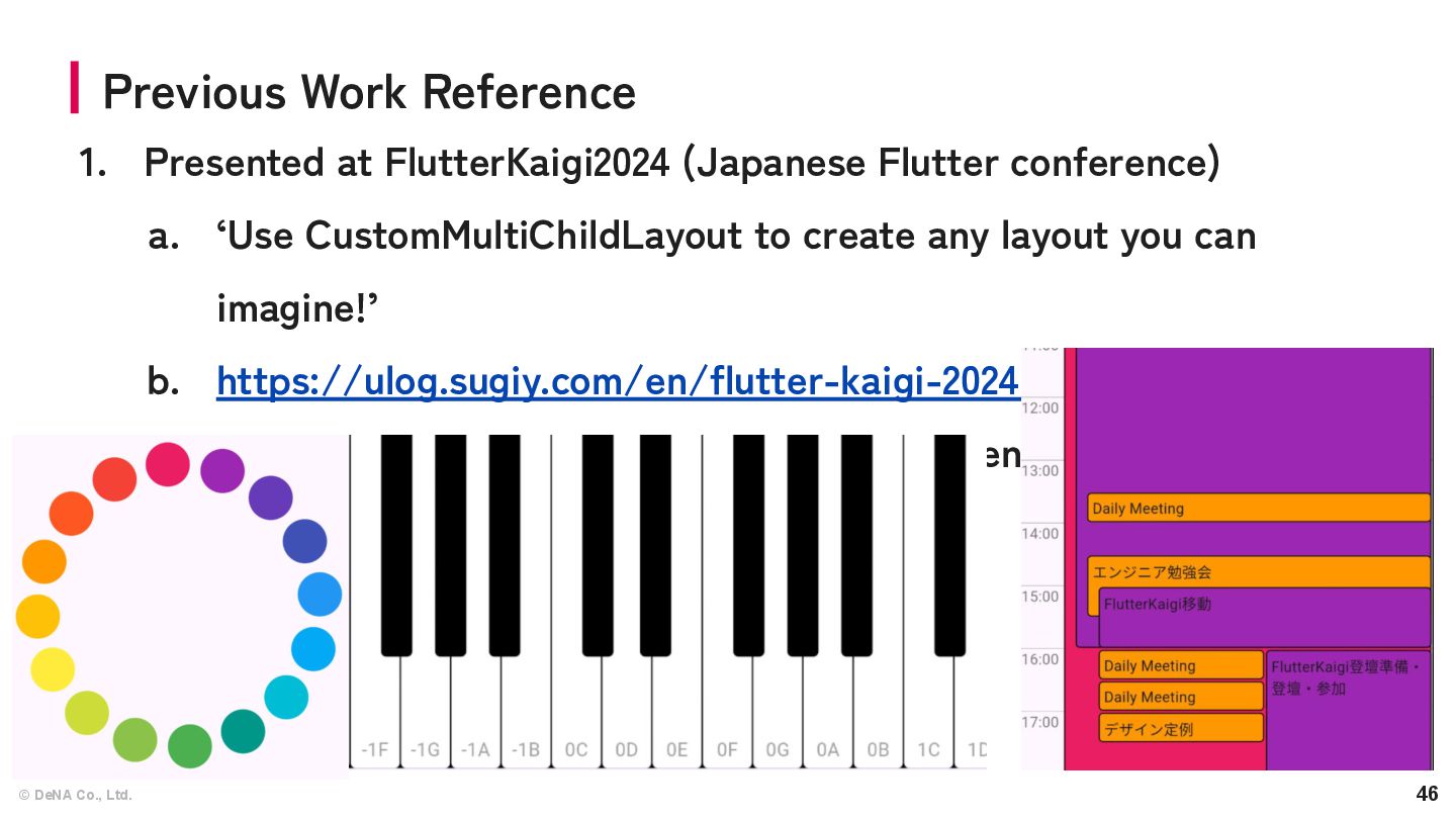at FlutterKaigi2024 (Japanese Flutter conference) a. ‘Use CustomMultiChildLayout to create any layout you can imagine!’ b. https://ulog.sugiy.com/en/flutter-kaigi-2024/ 2. Examples: circular, piano keyboard, Google Calendar-like timeline UI