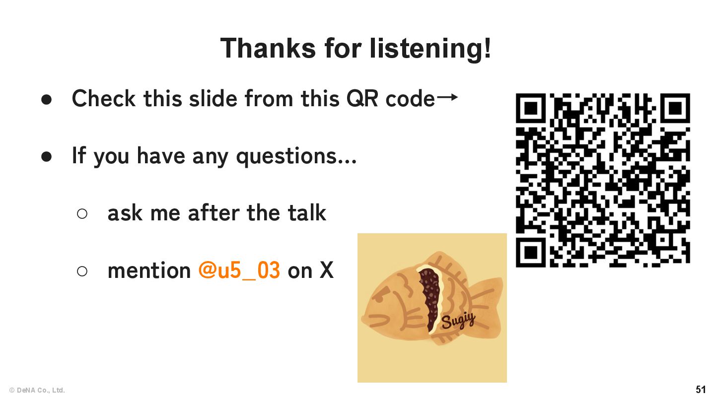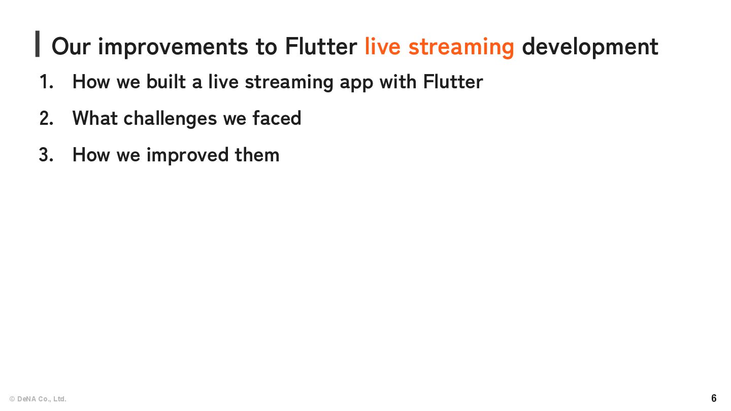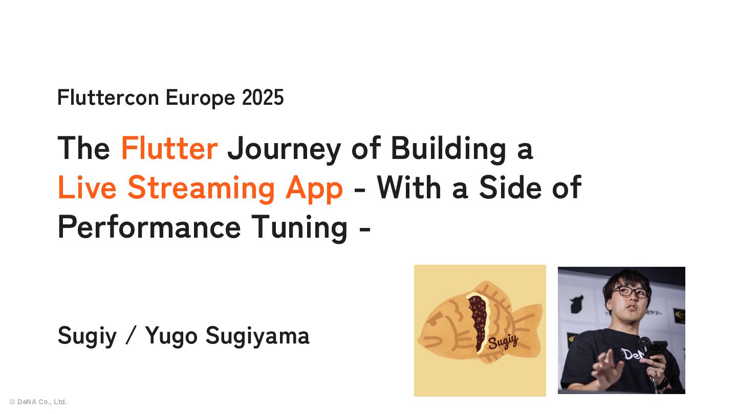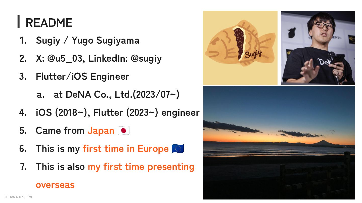 Sugiyama 2. X: @u5_03, LinkedIn: @sugiy 3. Flutter/iOS Engineer a. at DeNA Co., Ltd.(2023/07~) 4. iOS (2018~), Flutter (2023~) engineer 5. Came from Japan 6. This is my first time in Europe 7. This is also my first time presenting overseas