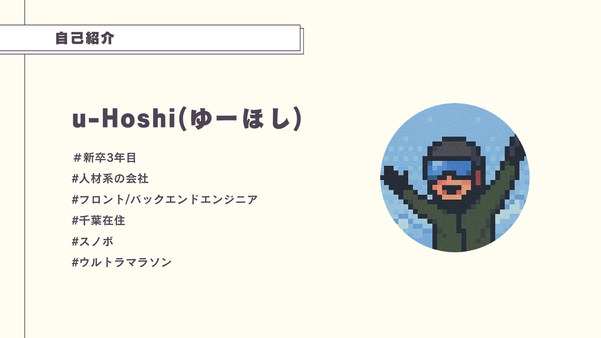自己紹介 u-Hoshi(ゆーほし) #新卒3年目 #人材系の会社 #フロント/バックエンドエンジニア #千葉在住 #スノボ #ウルトラマラソン