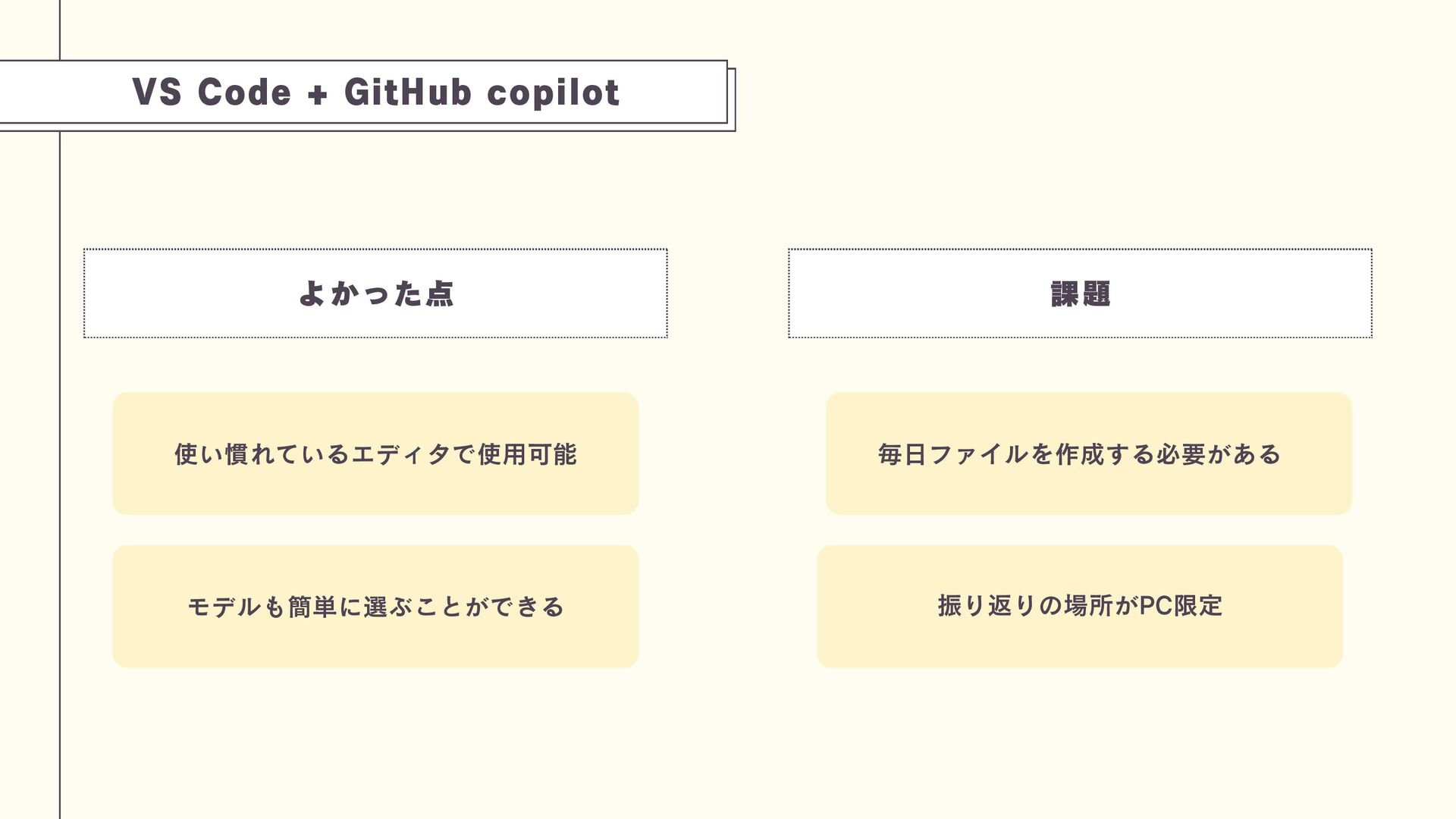VS Code + GitHub copilot よかった点 使い慣れているエディタで使用可能 モデルも簡単に選ぶことができる 課題 毎日ファイルを作成する必要がある
