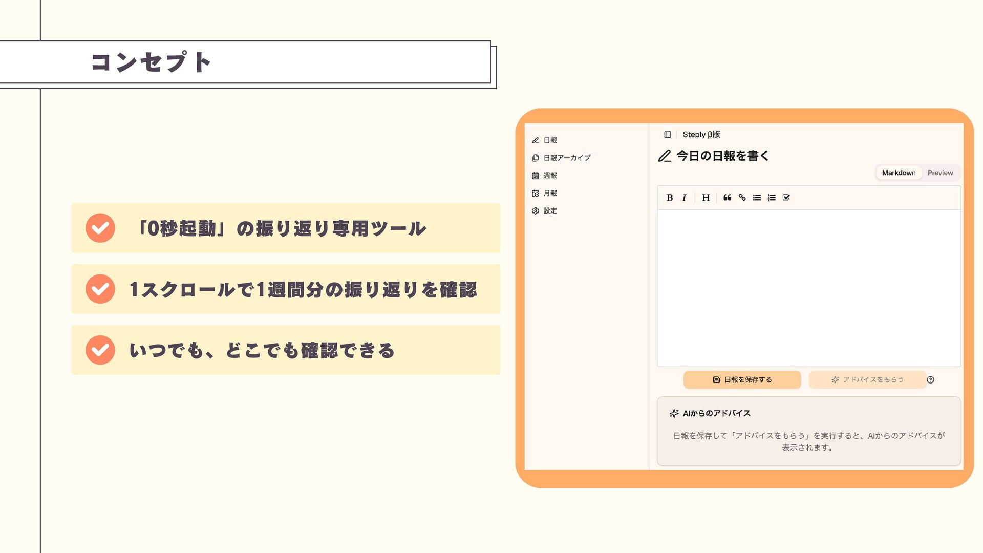 コンセプト 「0秒起動」の振り返り専用ツール 1スクロールで1週間分の振り返りを確認 いつでも、どこでも確認できる