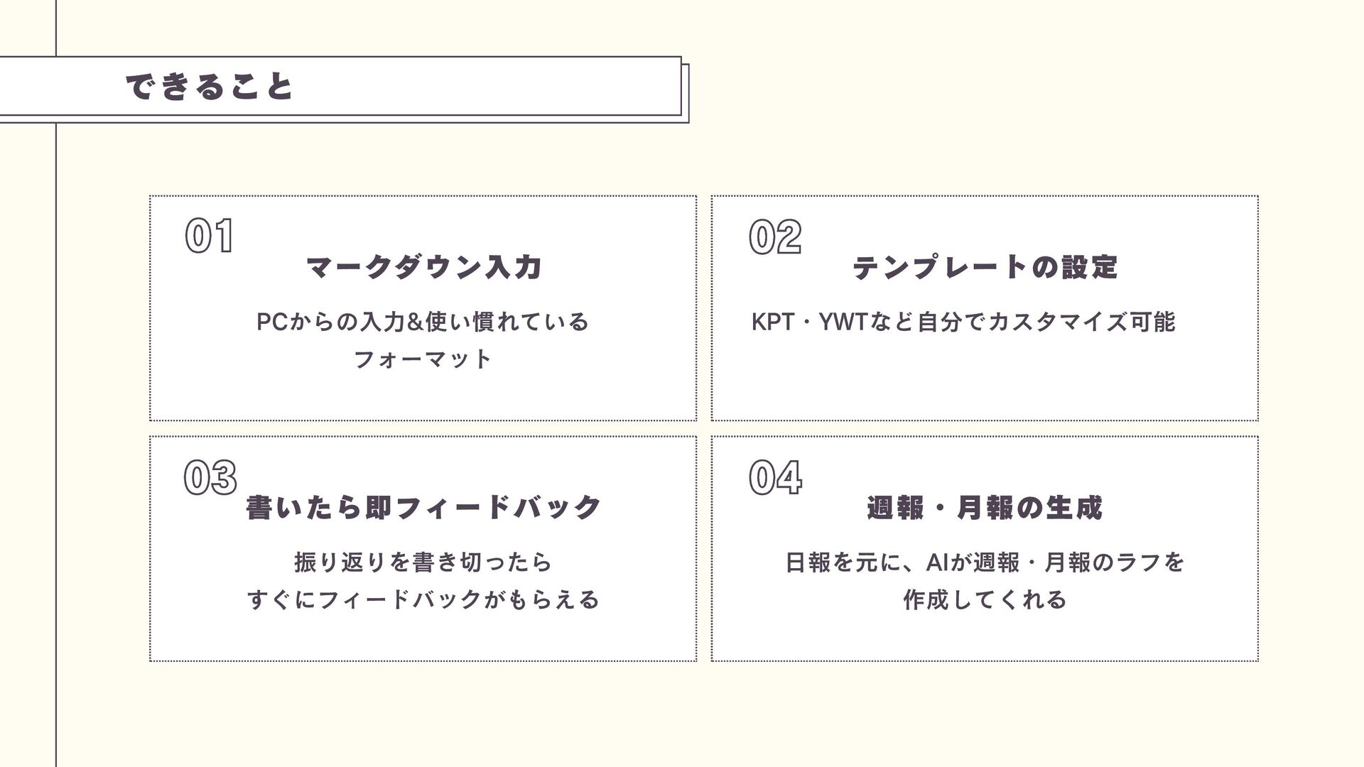 日報を元に、AIが週報・月報のラフを 作成してくれる 01 03 02 04