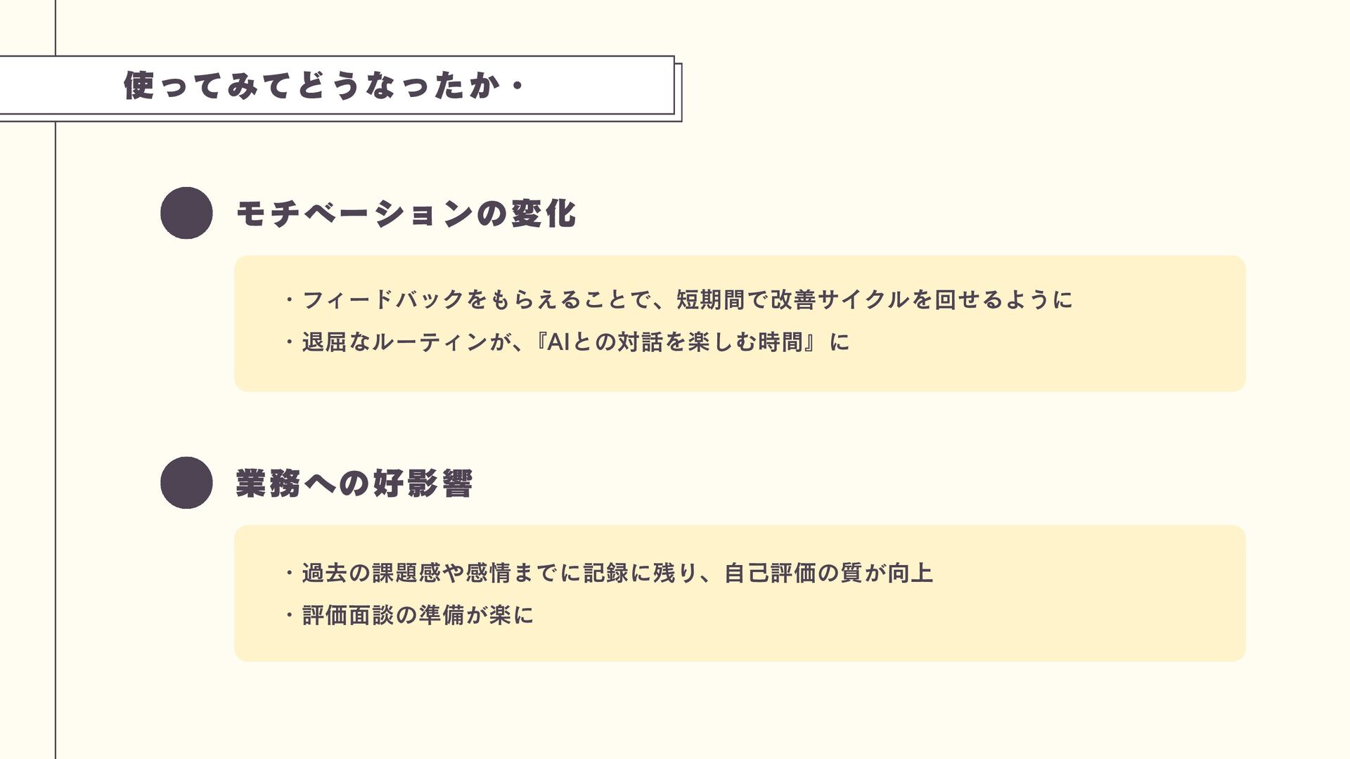 使ってみてどうなったか・ モチベーションの変化 ・フィードバックをもらえることで、短期間で改善サイクルを回せるように ・退屈なルーティンが、 『AIとの対話を楽しむ時間』に 業務への好影響 ・過去の課題感や感情までに記録に残り、自己評価の質が向上 ・評価面談の準備が楽に