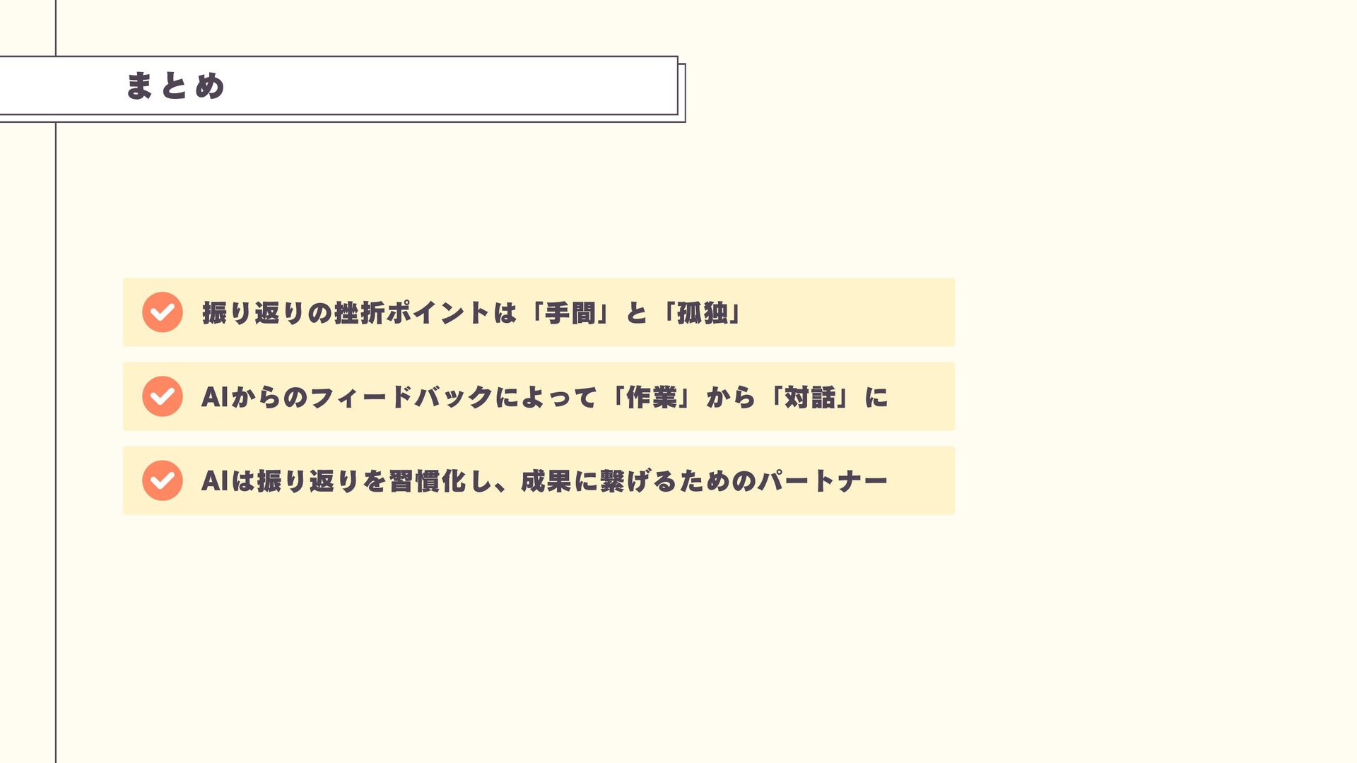 まとめ 振り返りの挫折ポイントは「手間」と「孤独」 AIからのフィードバックによって「作業」から「対話」に AIは振り返りを習慣化し、成果に繋げるためのパートナー