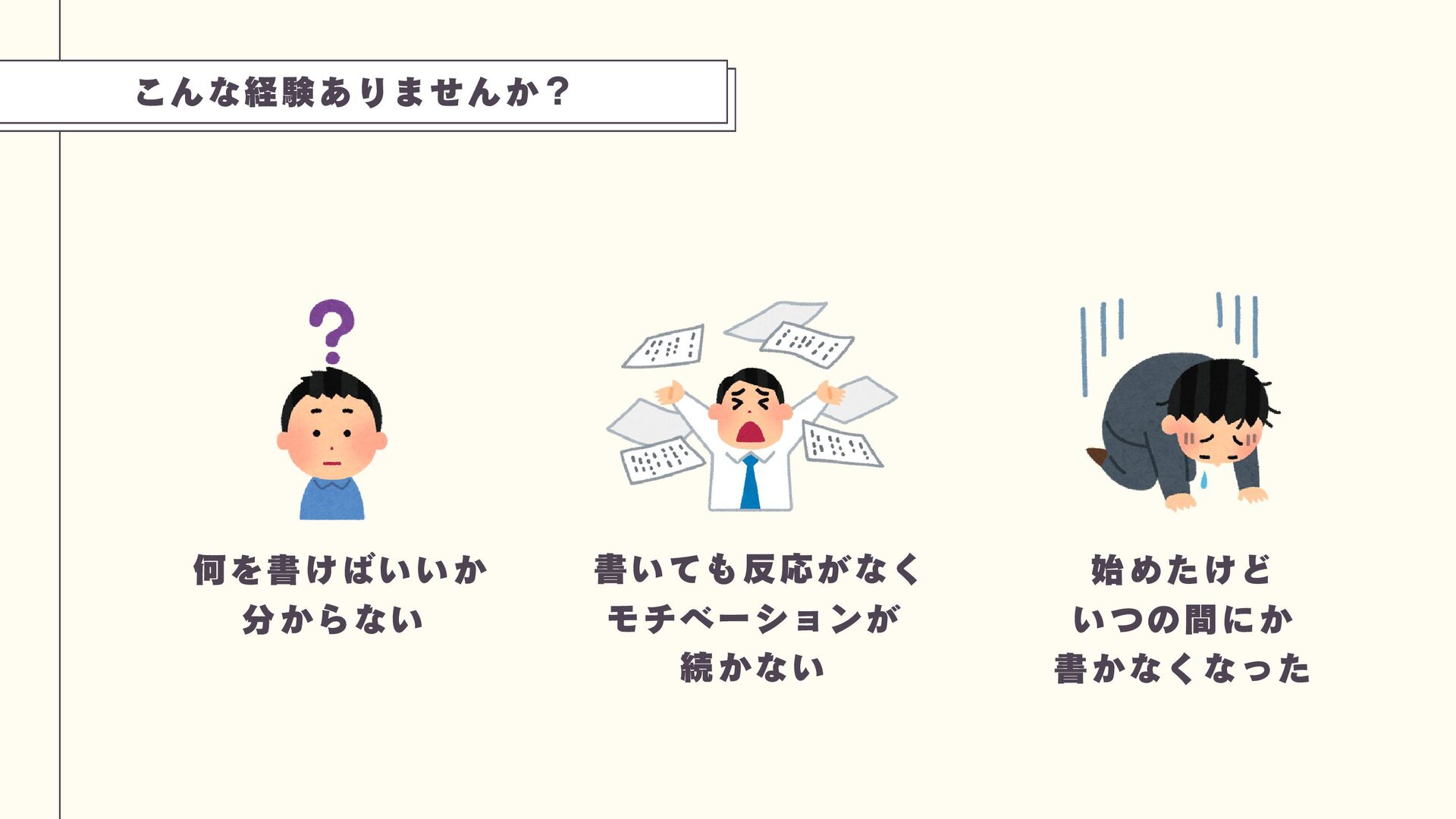 こんな経験ありませんか? 始めたけど いつの間にか 書かなくなった 書いても反応がなく モチベーションが 続かない 何を書けばいいか 分からない