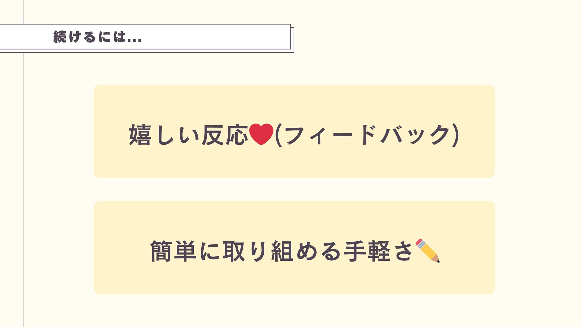 続けるには... 嬉しい反応 ❤️(フィードバック) 簡単に取り組める手軽さ ✏️
