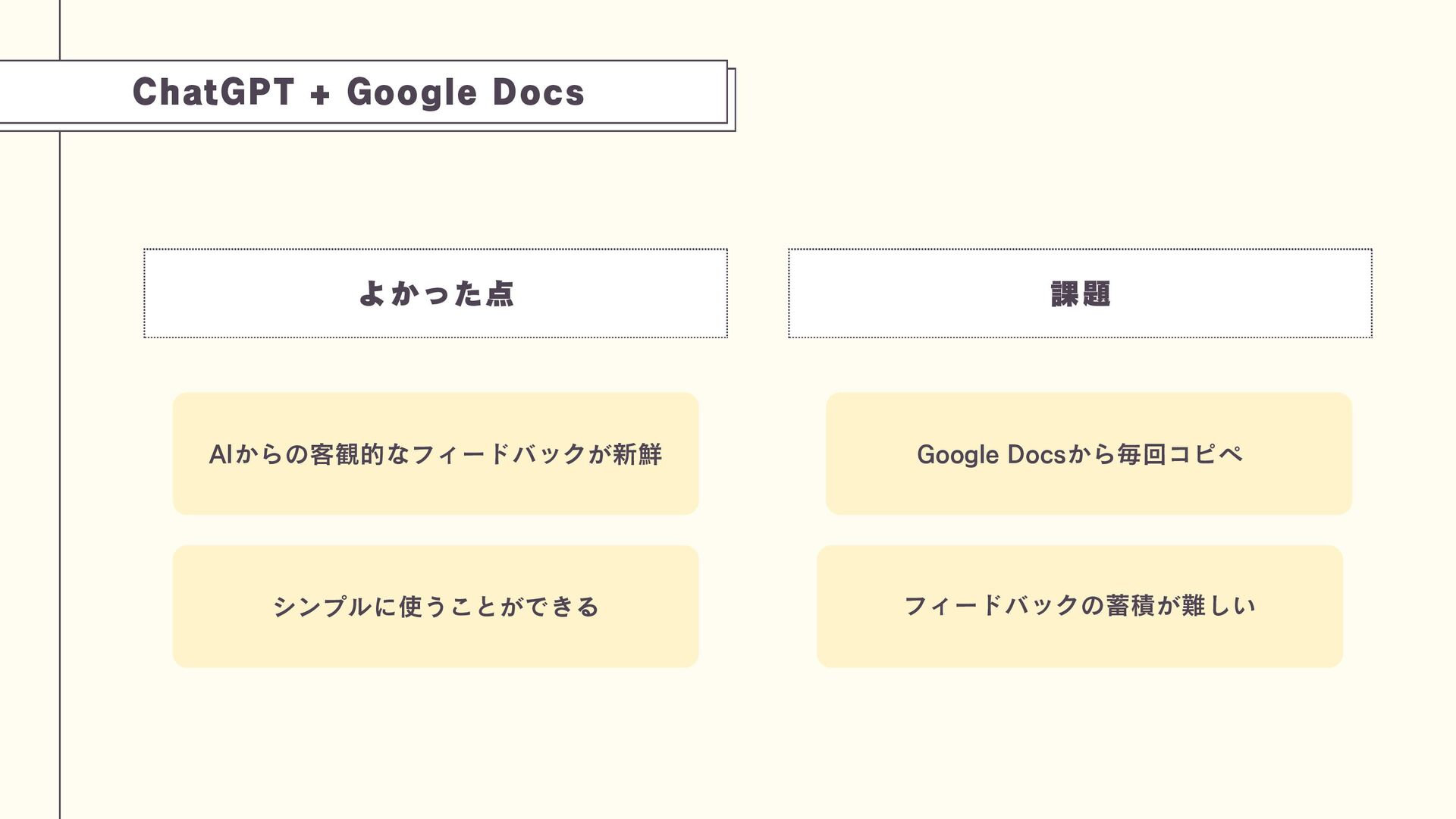 ChatGPT + Google Docs よかった点 AIからの客観的なフィードバックが新鮮 シンプルに使うことができる 課題 Google Docsから毎回コピペ