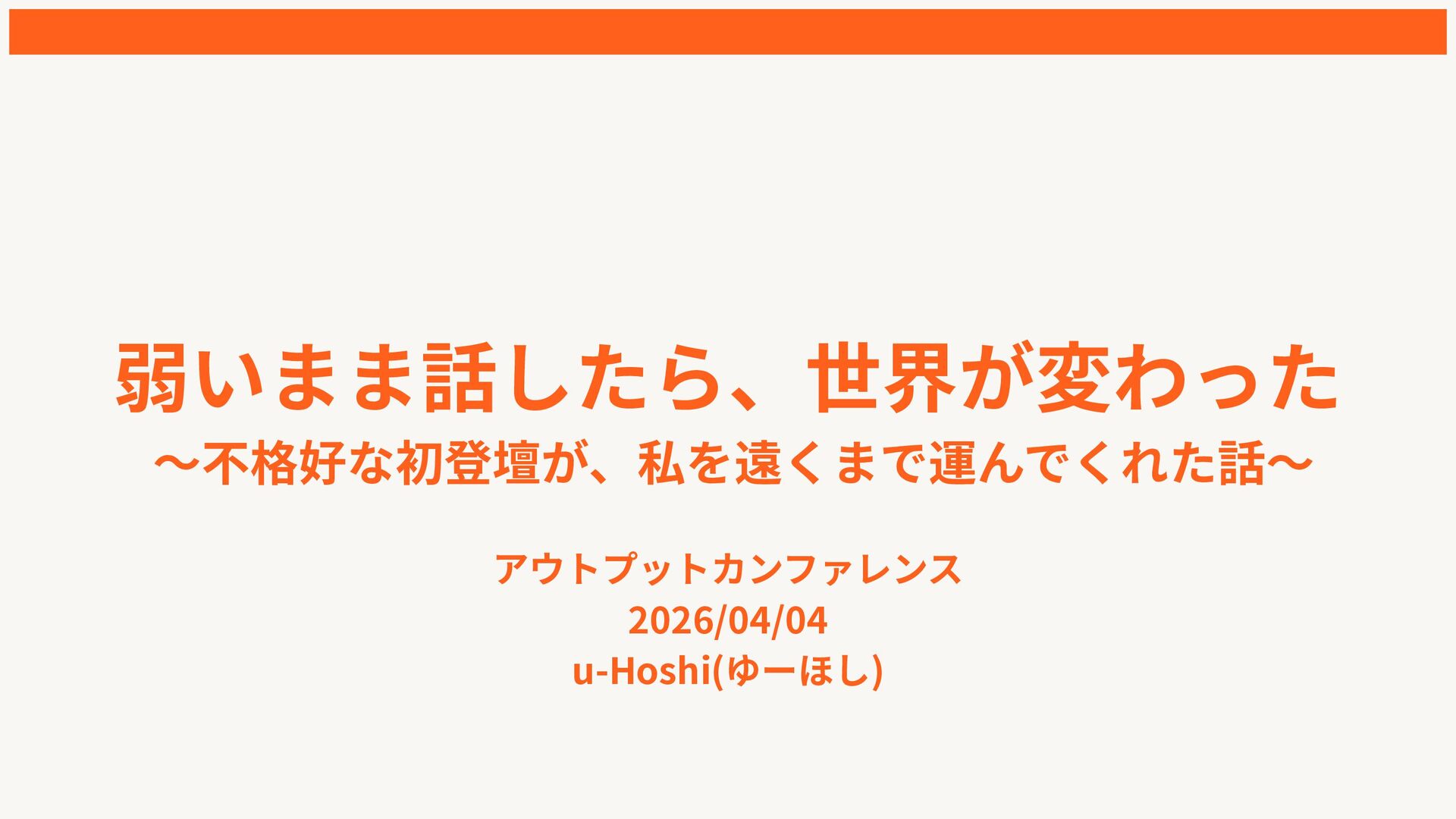 弱いまま話したら、世界が変わった 〜不格好な初登壇が、私を遠くまで運んでくれた話〜 アウトプットカンファレンス 2026/04/04 u-Hoshi(ゆーほし)