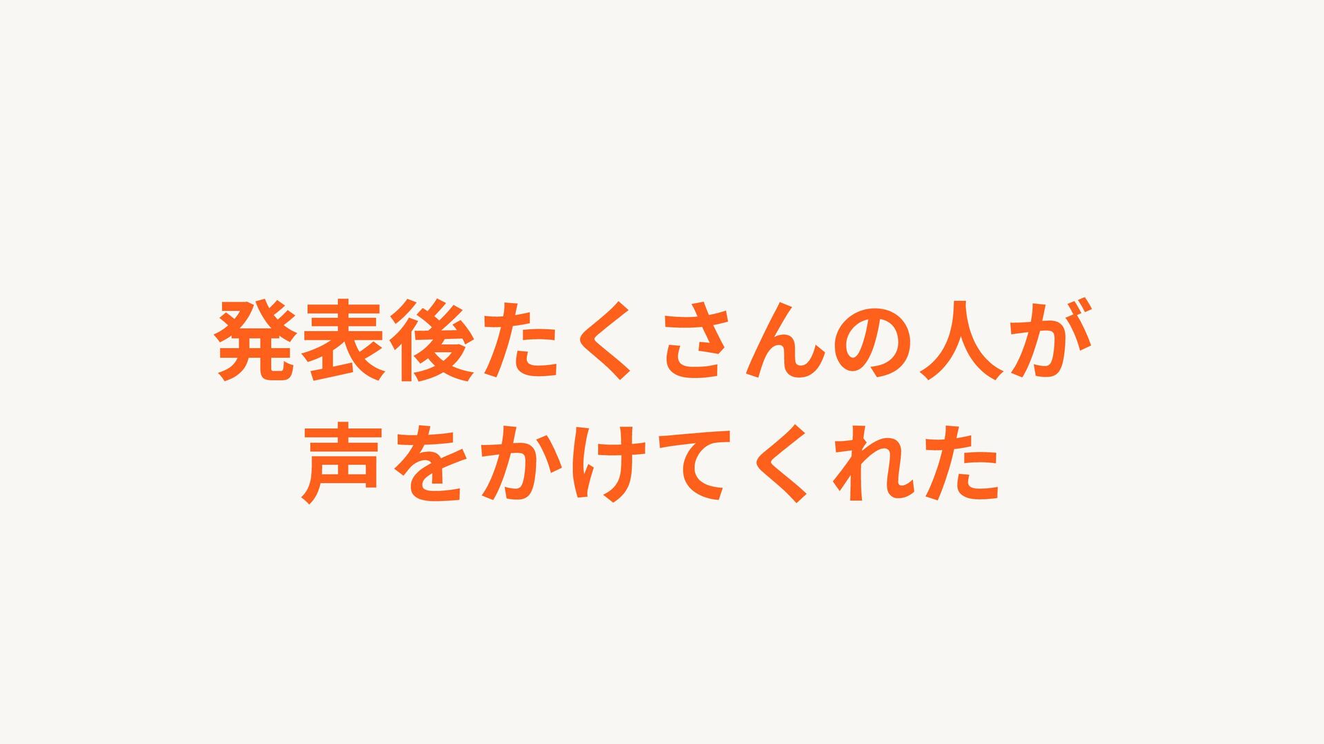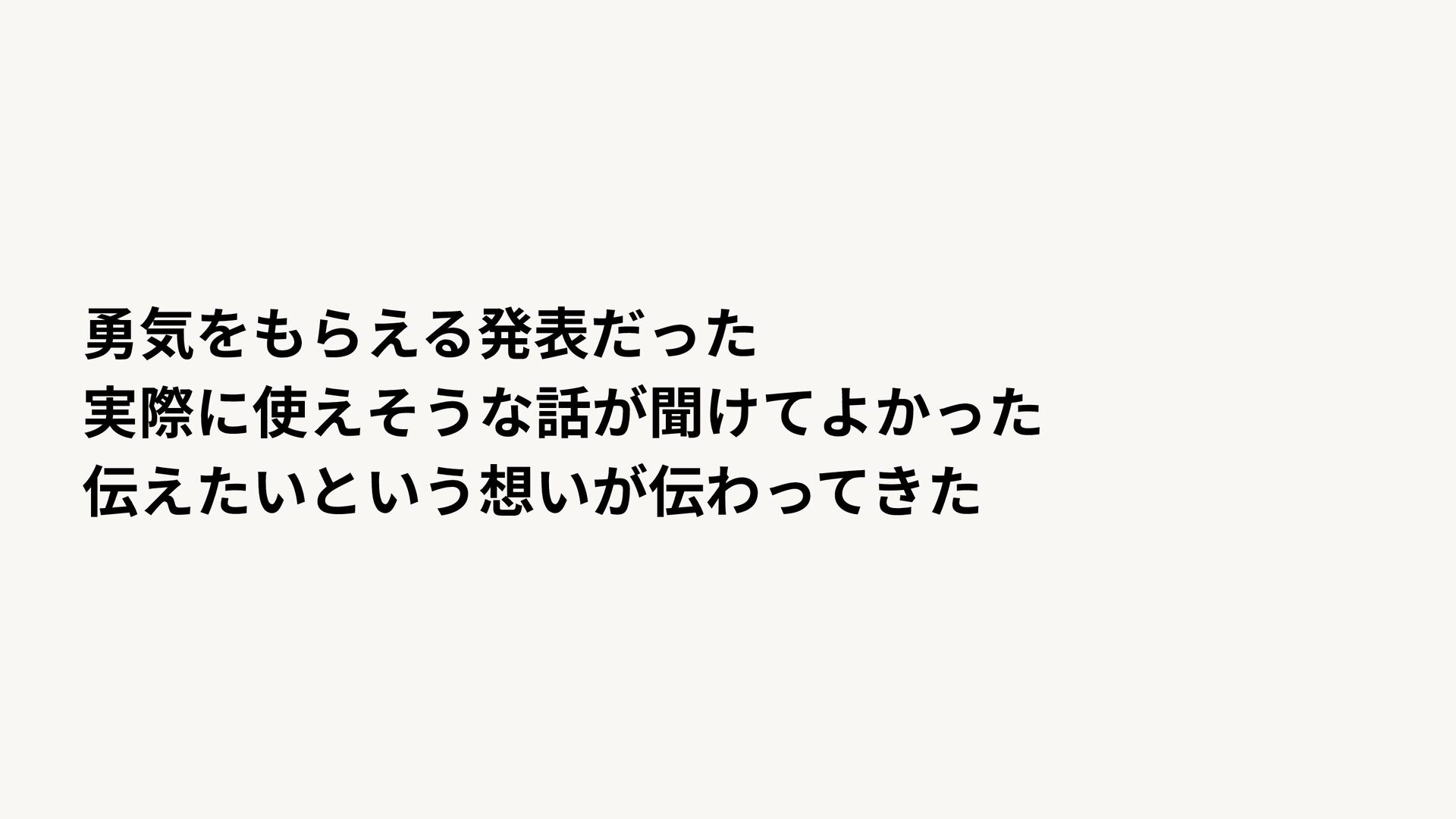 勇気をもらえる発表だった 実際に使えそうな話が聞けてよかった 伝えたいという想いが伝わってきた