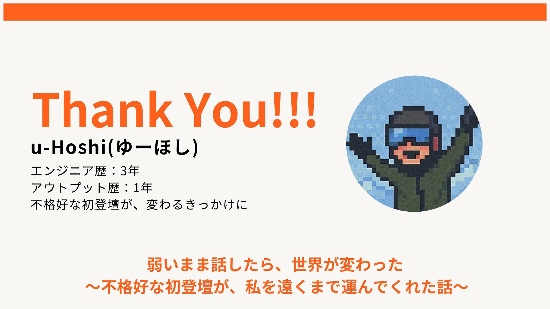 u-Hoshi(ゆーほし) Thank You!!! 弱いまま話したら、世界が変わった 〜不格好な初登壇が、私を遠くまで運んでくれた話〜 エンジニア歴:3年 アウトプット歴:1年 不格好な初登壇が、変わるきっかけに