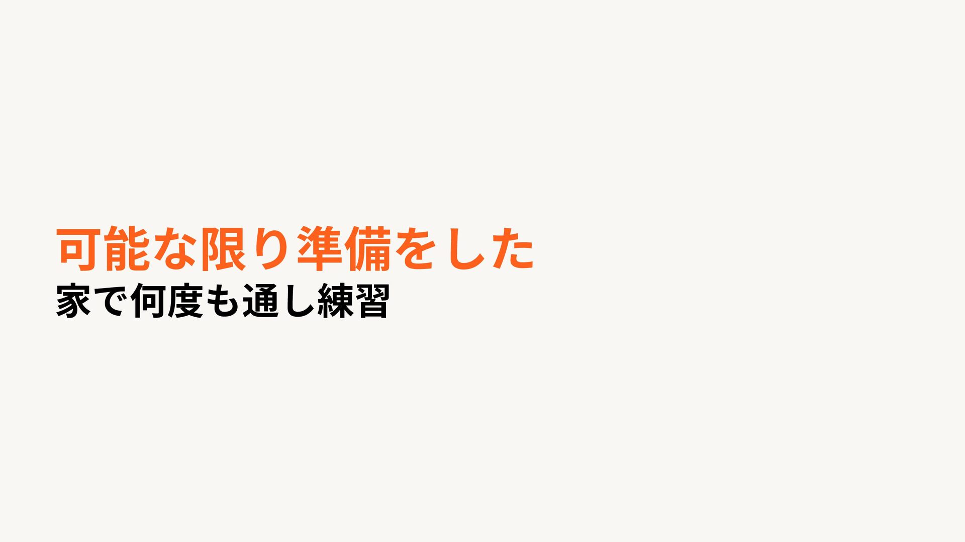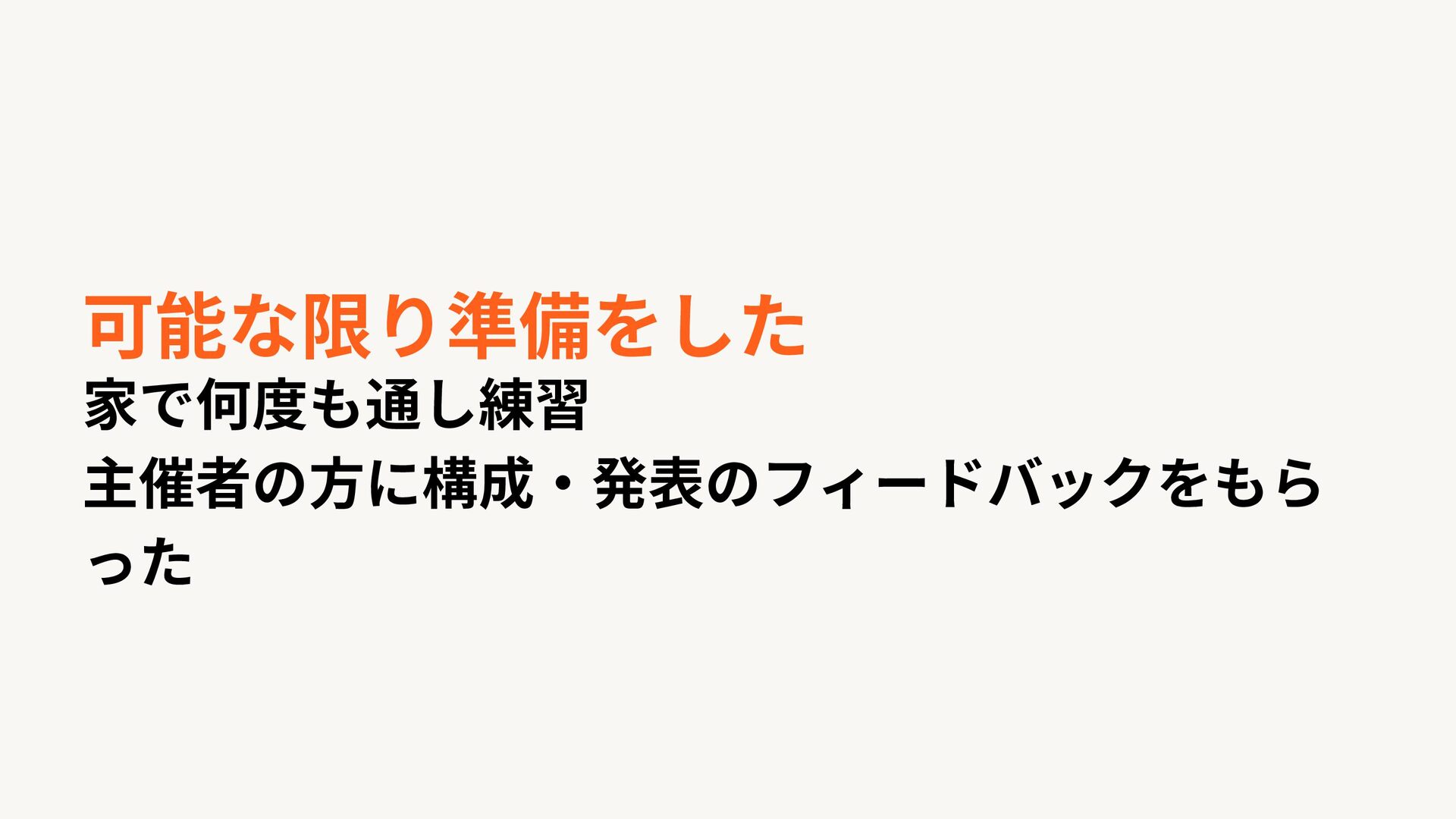 可能な限り準備をした 家で何度も通し練習 主催者の方に構成・発表のフィードバックをもら った