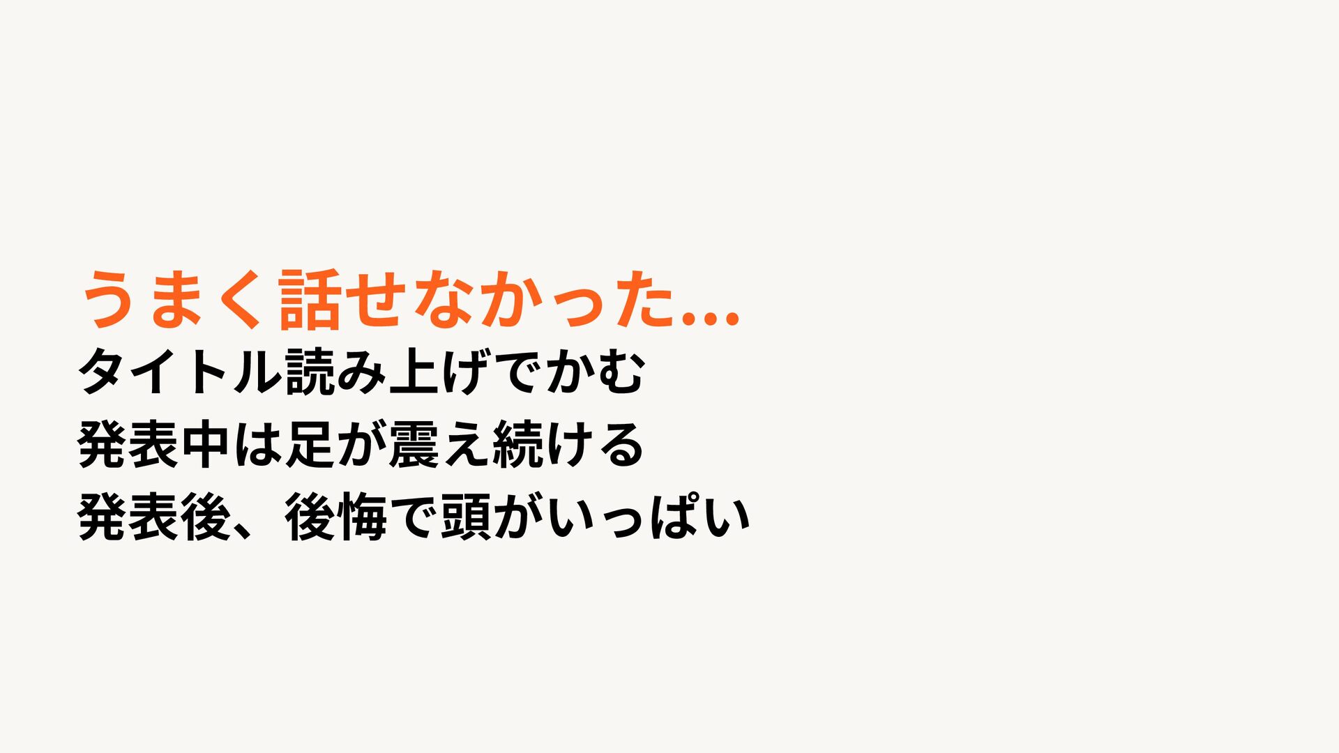うまく話せなかった... タイトル読み上げでかむ 発表中は足が震え続ける 発表後、後悔で頭がいっぱい
