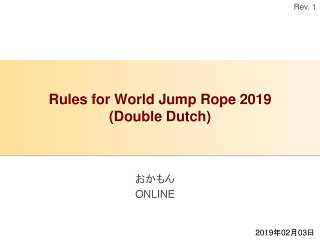 Managerに言う) – 間違った音楽のまま続けた場合はRe-jumpが認められないので注意する • 男女混合の総合に出たい場合は、全種目に男女が出場 • ダブルダッチは、全員がJumperかTurnerに関係 – FISACはターナー2人限定だが、WJRではターナーが3人4人でも問題ない – 但し、要項の7ページ目にはペアフリースタイルについて次のような記述あり “teams of four people perform a choreographed double dutch routine, which will primarily involve two athletes performing skills in the ropes at the same time (基本的には2 人(3人)の選手が縄の中で同時に技を行う)” 8
