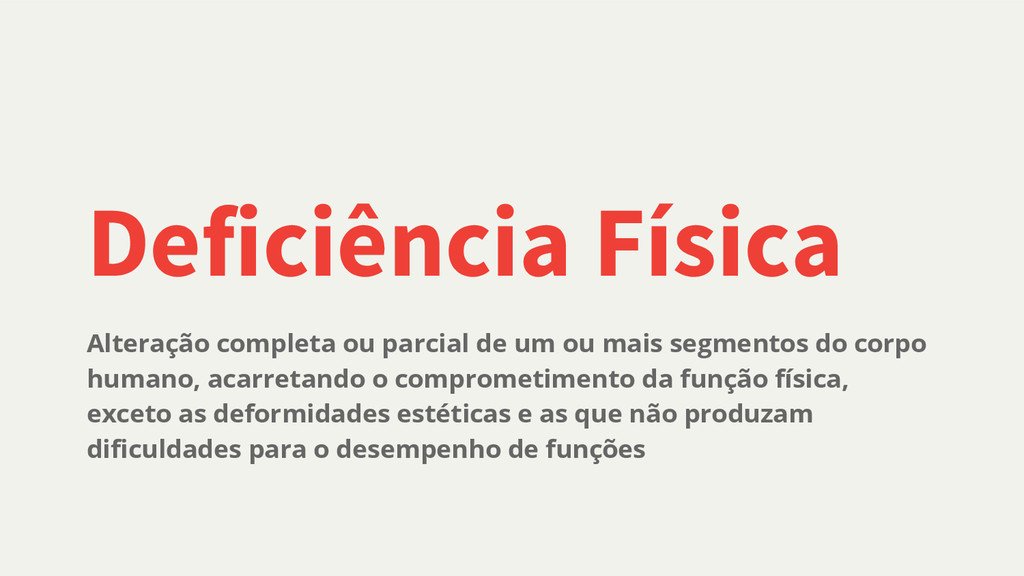 segmentos do corpo humano, acarretando o comprometimento da função física, exceto as deformidades estéticas e as que não produzam dificuldades para o desempenho de funções