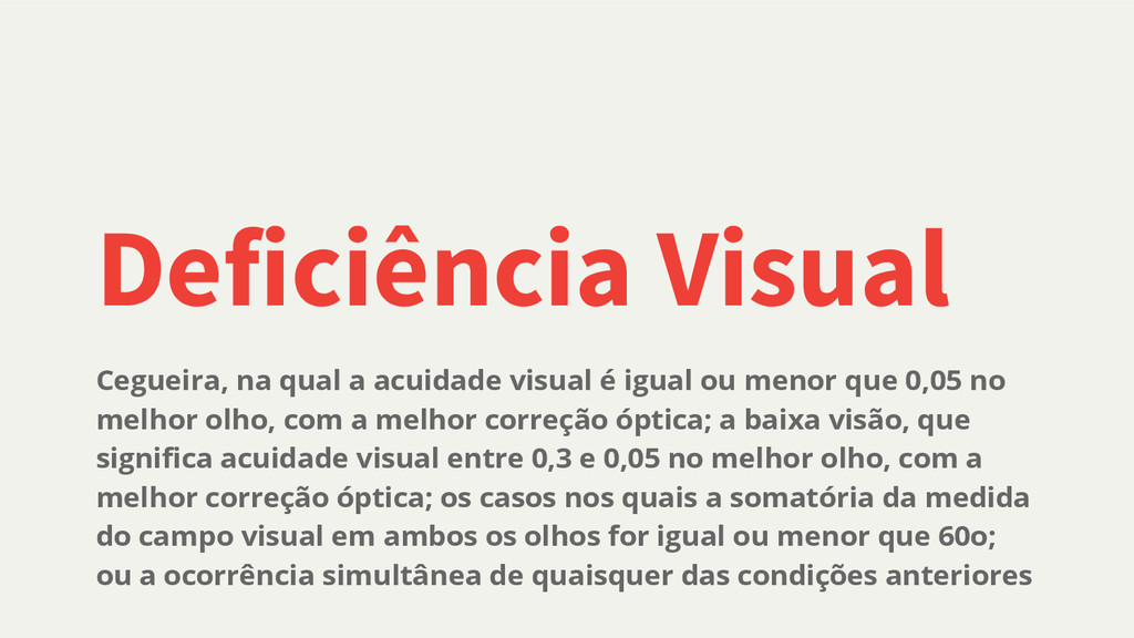 ou menor que 0,05 no melhor olho, com a melhor correção óptica; a baixa visão, que significa acuidade visual entre 0,3 e 0,05 no melhor olho, com a melhor correção óptica; os casos nos quais a somatória da medida do campo visual em ambos os olhos for igual ou menor que 60o; ou a ocorrência simultânea de quaisquer das condições anteriores