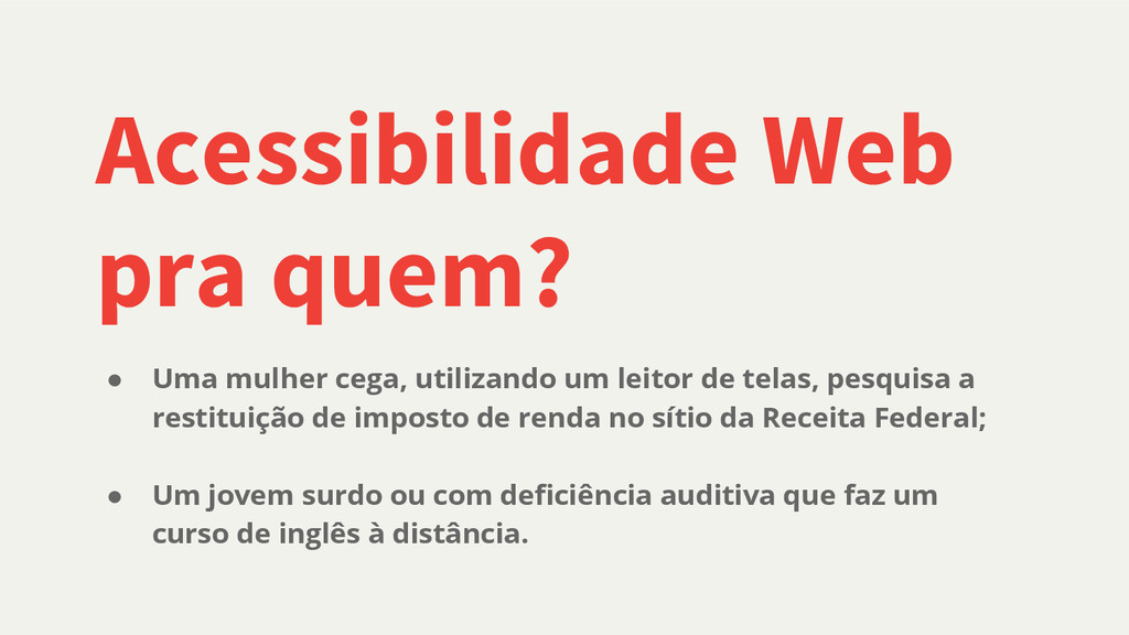a restituição de imposto de renda no sítio da Receita Federal; • Um jovem surdo ou com deficiência auditiva que faz um curso de inglês à distância. Acessibilidade Web pra quem?