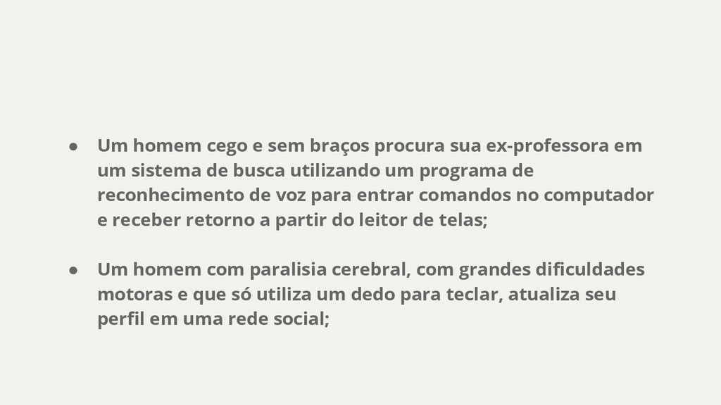 em um sistema de busca utilizando um programa de reconhecimento de voz para entrar comandos no computador e receber retorno a partir do leitor de telas; • Um homem com paralisia cerebral, com grandes dificuldades motoras e que só utiliza um dedo para teclar, atualiza seu perfil em uma rede social;