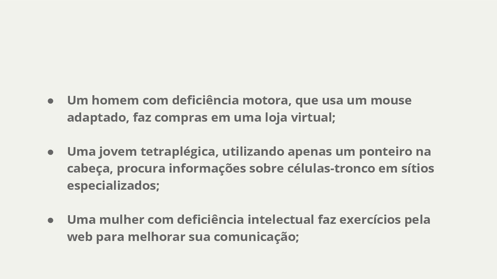 adaptado, faz compras em uma loja virtual; • Uma jovem tetraplégica, utilizando apenas um ponteiro na cabeça, procura informações sobre células-tronco em sítios especializados; • Uma mulher com deficiência intelectual faz exercícios pela web para melhorar sua comunicação;