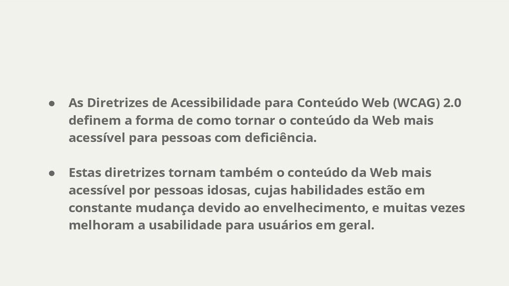 definem a forma de como tornar o conteúdo da Web mais acessível para pessoas com deficiência. • Estas diretrizes tornam também o conteúdo da Web mais acessível por pessoas idosas, cujas habilidades estão em constante mudança devido ao envelhecimento, e muitas vezes melhoram a usabilidade para usuários em geral.