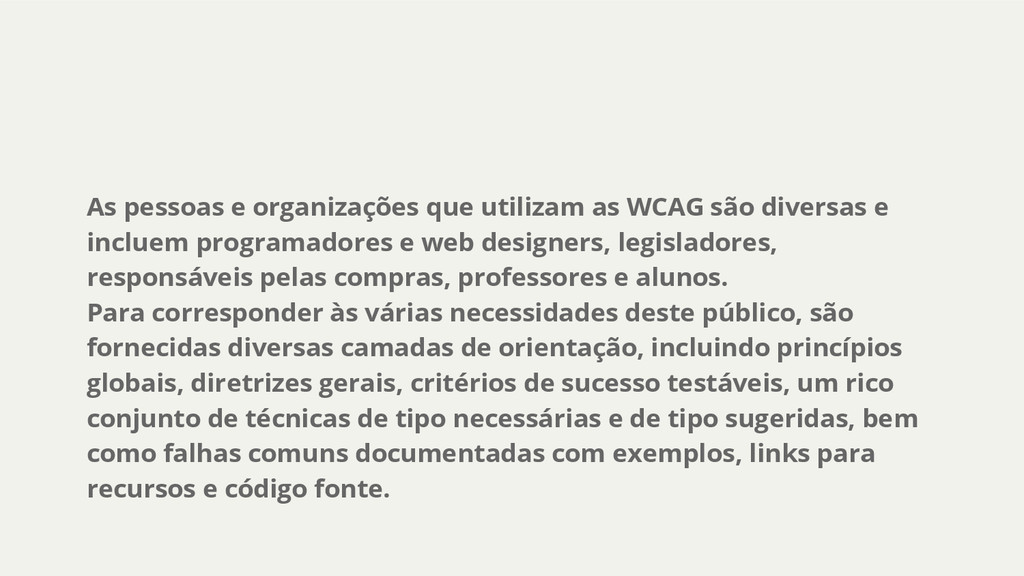e incluem programadores e web designers, legisladores, responsáveis pelas compras, professores e alunos. Para corresponder às várias necessidades deste público, são fornecidas diversas camadas de orientação, incluindo princípios globais, diretrizes gerais, critérios de sucesso testáveis, um rico conjunto de técnicas de tipo necessárias e de tipo sugeridas, bem como falhas comuns documentadas com exemplos, links para recursos e código fonte.