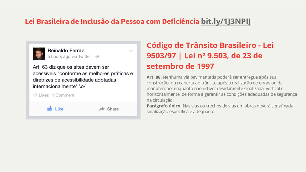 de Trânsito Brasileiro - Lei 9503/97 | Lei nº 9.503, de 23 de setembro de 1997 Art. 88. Nenhuma via pavimentada poderá ser entregue após sua construção, ou reaberta ao trânsito após a realização de obras ou de manutenção, enquanto não estiver devidamente sinalizada, vertical e horizontalmente, de forma a garantir as condições adequadas de segurança na circulação. Parágrafo único. Nas vias ou trechos de vias em obras deverá ser afixada sinalização específica e adequada.
