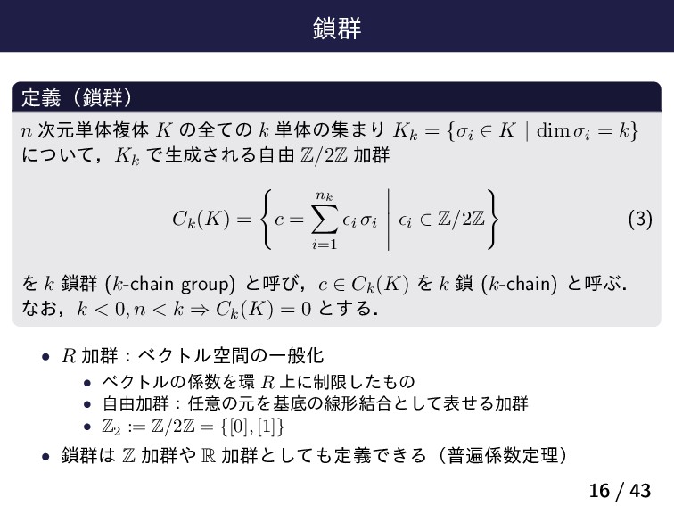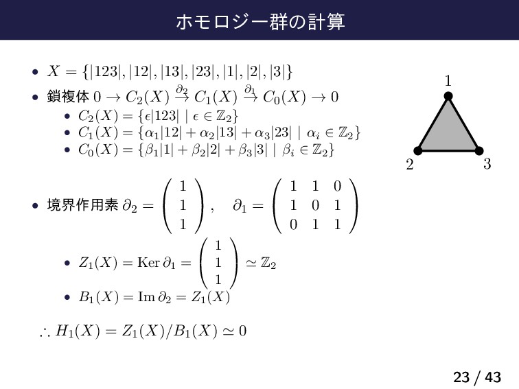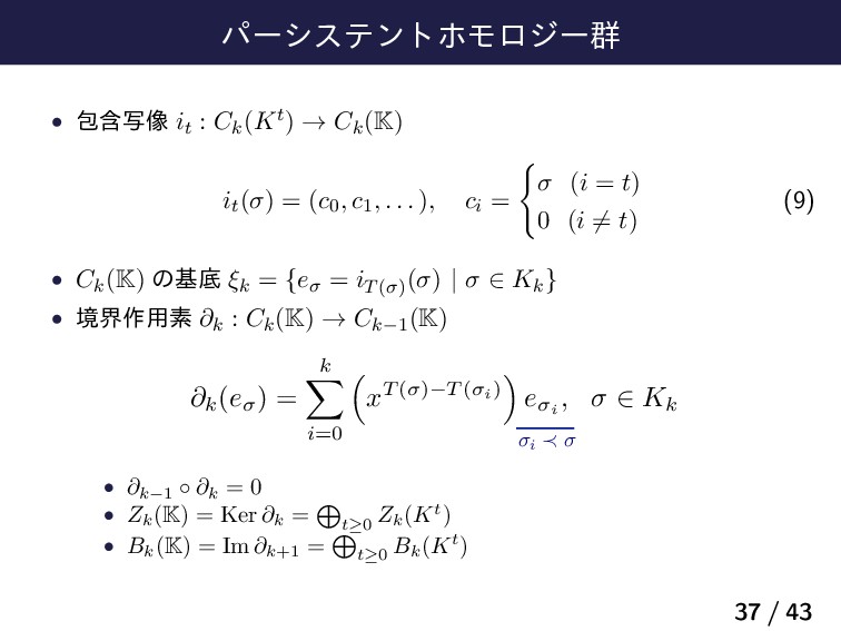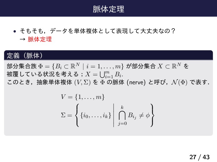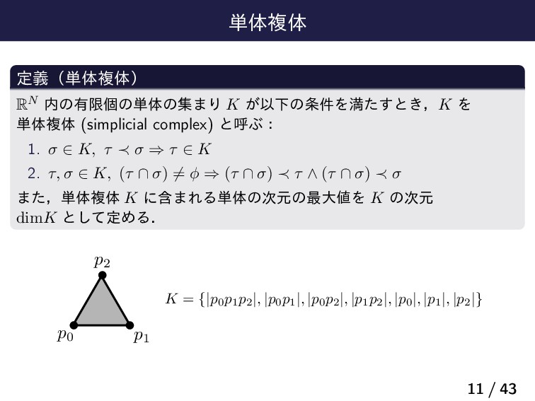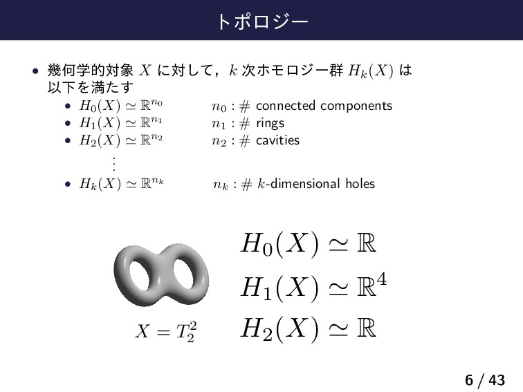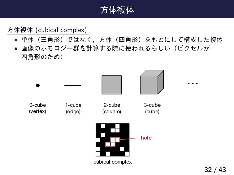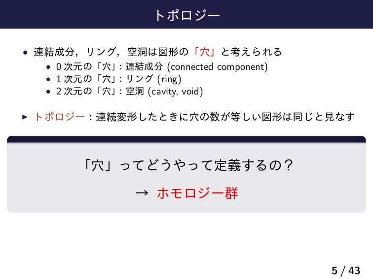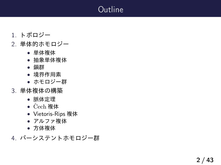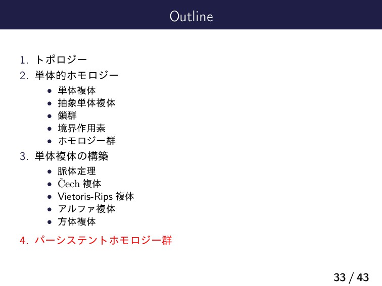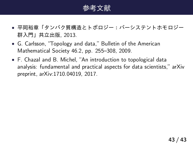 data,” Bulletin of the American Mathematical Society 46.2, pp. 255–308, 2009. • F. Chazal and B. Michel, “An introduction to topological data analysis: fundamental and practical aspects for data scientists,” arXiv preprint, arXiv:1710.04019, 2017. 43 / 43