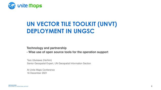 DEPARTMENT OF OPERATIONAL SUPPORT UN VECTOR TILE TOOLKIT (UNVT) DEPLOYMENT IN UNGSC Technology and partnership - Wise use of open source tools for the operation support Taro Ubukawa (He/him) Senior Geospatial Expert, UN Geospatial Information Section At Unite Maps Conference 16 December 2021