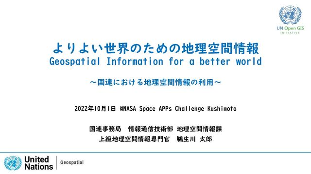 INTERNATIONAL LAW 地理空間情報を普遍的に利用(universal use)することで、 よりよい世界のため国連が行っている活動や任務を支える。 (国連事務局 地理空間情報戦略より) 平和と安全 人権 持続可能な開発 人道支援 国際法 Geospatial Strategy for the United Nations: https://www.un.org/geospatial/sites/www.un.org.geospatial/files/20210330_g eospatial_strategy_for_the_united_nations-book.pdf