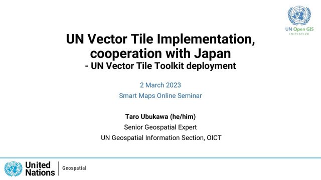 for UN operations • Efficient map delivery • Frequent update is needed • Scaling in a cost-efficient manner. • Etc.. Technical know-how, experiences From Geospatial Information Authority of Japan Base map delivery with vector tile • Optimized data size, efficient delivery • Flexible map design • Working experiences with open source community In the UN Secretariat, colleagues also started using vector tile for base map delivery. There are still a lot of value added by open source approaches. 2016- 2018- UNVT (UN Vector Tile Toolkit) to combine efforts by all • It is a collection of open source software to produce, host, style, optimize and use vector tiles for web mapping. It also shares technical know-how. • UNVT is an effort under the UN Open GIS Initiatives. It was initiated by Mr. Hidenori Fujimura in 2018.