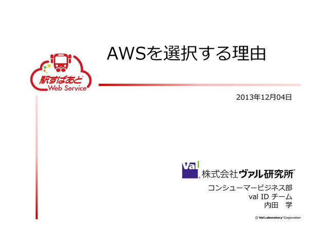 AWSを選択する理由 2013年12月04日 コンシューマービジネス部 val ID チーム 内田 学