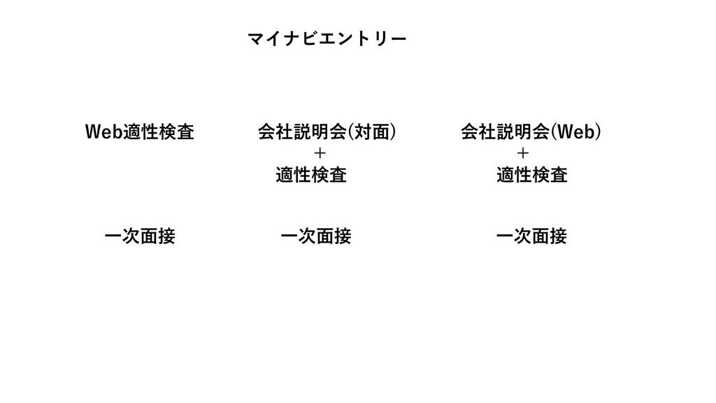 Web適性検査 マイナビエントリー 会社説明会(対面) + 適性検査 会社説明会(Web) + 適性検査 一次面接 一次面接