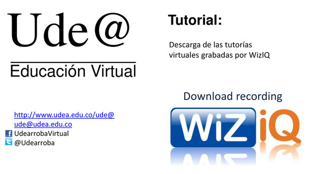 WizIQ abre una pestaña nueva e ingresa al enlace de las tutorías en el aula Moodle de Ude@ (desde el mismo navegador). 3. Da clic en el botón View Recording de la clase que quieres ver o descargar.
