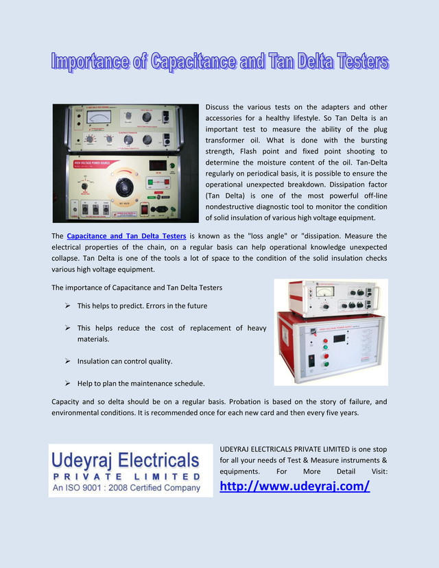 for a healthy lifestyle. So Tan Delta is an important test to measure the ability of the plug transformer oil. What is done with the bursting strength, Flash point and fixed point shooting to determine the moisture content of the oil. Tan-Delta regularly on periodical basis, it is possible to ensure the operational unexpected breakdown. Dissipation factor (Tan Delta) is one of the most powerful off-line nondestructive diagnostic tool to monitor the condition of solid insulation of various high voltage equipment. The Capacitance and Tan Delta Testers is known as the "loss angle" or "dissipation. Measure the electrical properties of the chain, on a regular basis can help operational knowledge unexpected collapse. Tan Delta is one of the tools a lot of space to the condition of the solid insulation checks various high voltage equipment. The importance of Capacitance and Tan Delta Testers This helps to predict. Errors in the future This helps reduce the cost of replacement of heavy materials. Insulation can control quality. Help to plan the maintenance schedule. Capacity and so delta should be on a regular basis. Probation is based on the story of failure, and environmental conditions. It is recommended once for each new card and then every five years. UDEYRAJ ELECTRICALS PRIVATE LIMITED is one stop for all your needs of Test & Measure instruments & equipments. For More Detail Visit: http://www.udeyraj.com/