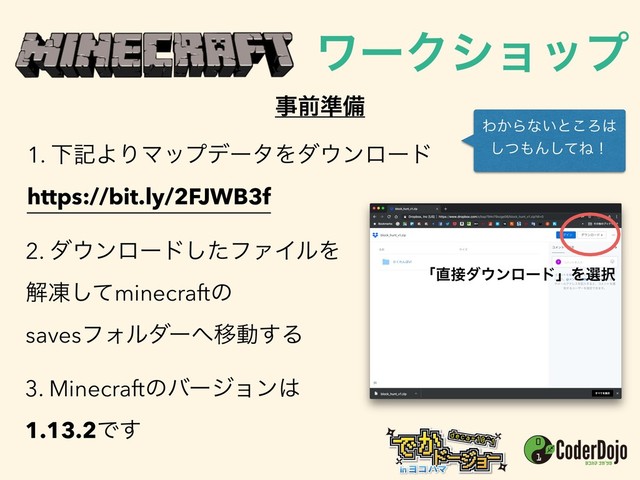 2019/3/31 「でかドージョー in 横浜 vol.2」のMinecraftワークショップで開催した資料です。