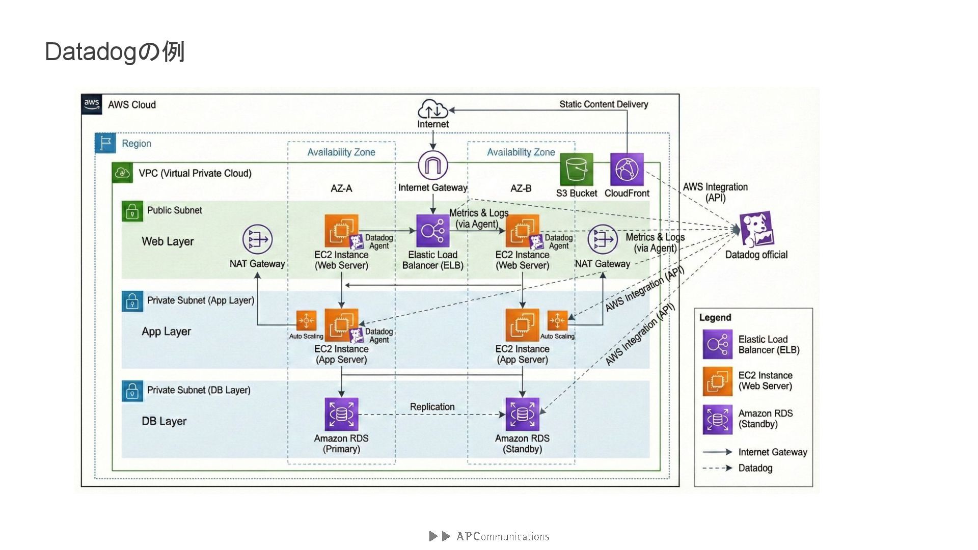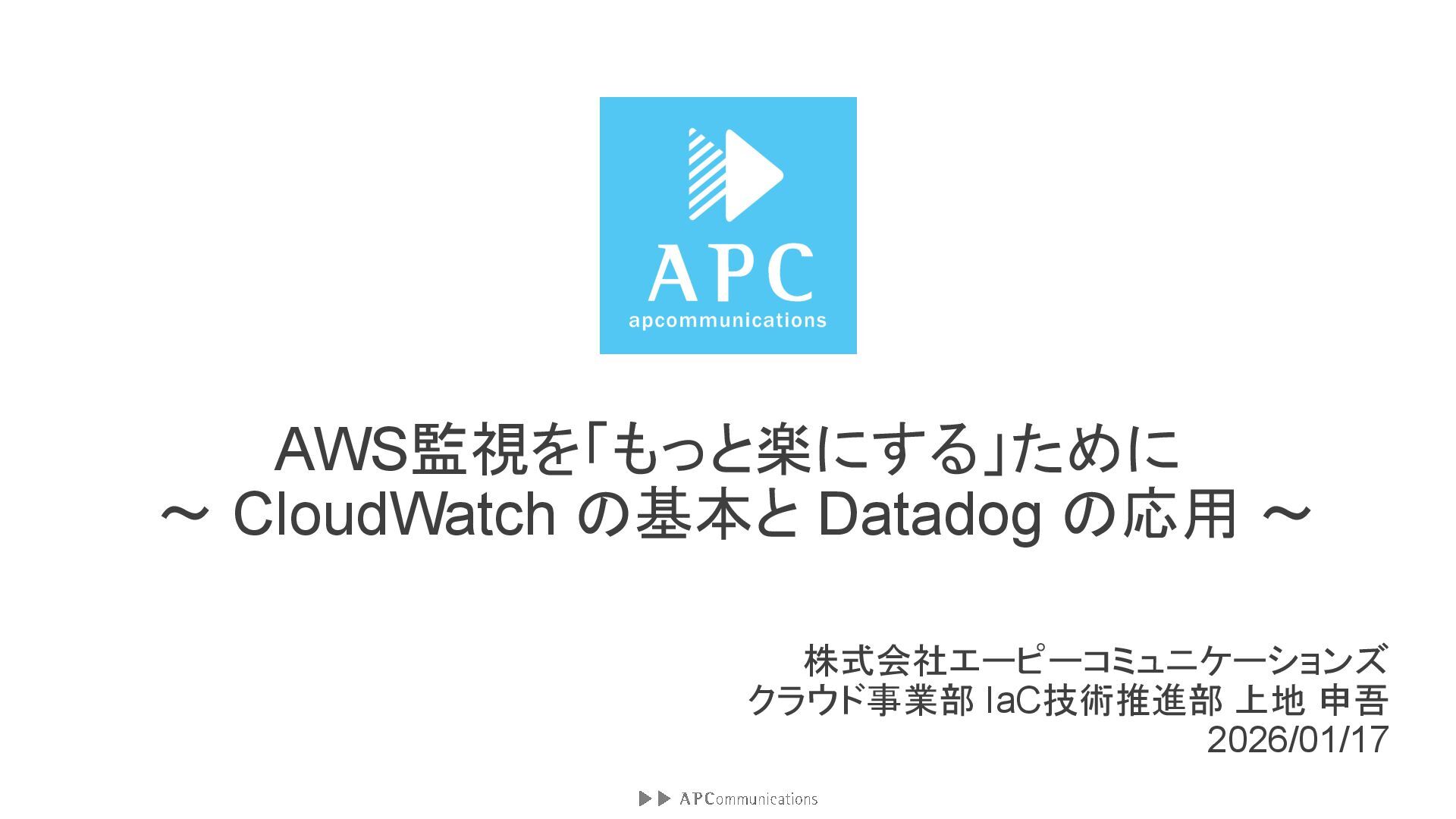 AWS監視を「もっと楽にする」ために 〜 CloudWatch の基本と Datadog の応用 〜 株式会社エーピーコミュニケーションズ クラウド事業部 IaC技術推進部