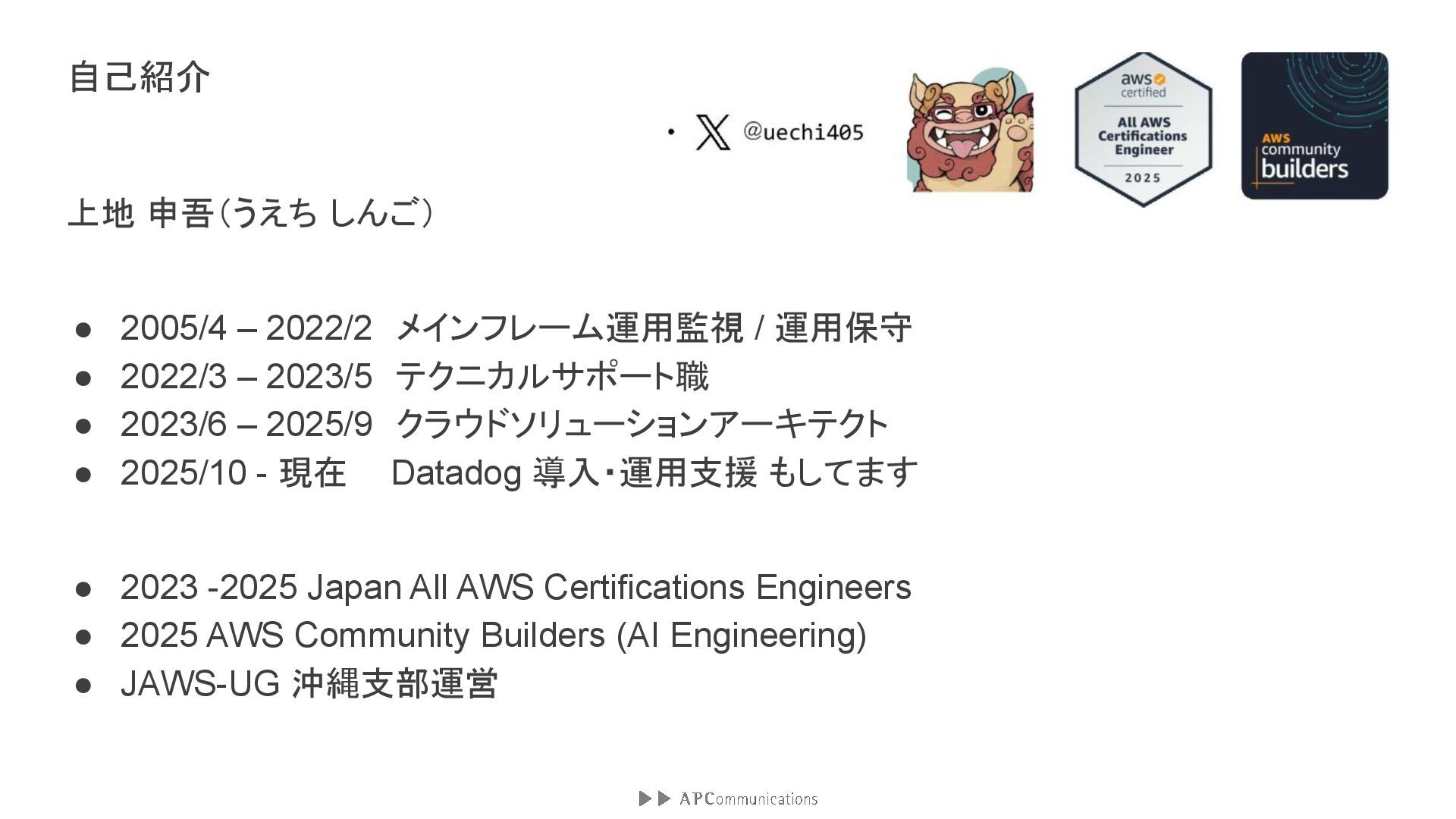 • 2022/3 – 2023/5 テクニカルサポート職 • 2023/6 – 2025/9 クラウドソリューションアーキテクト • 2025/10 - 現在 Datadog 導入・運用支援 もしてます • 2023 -2025 Japan All AWS Certifications Engineers • 2025 AWS Community Builders (AI Engineering) • JAWS-UG 沖縄支部運営