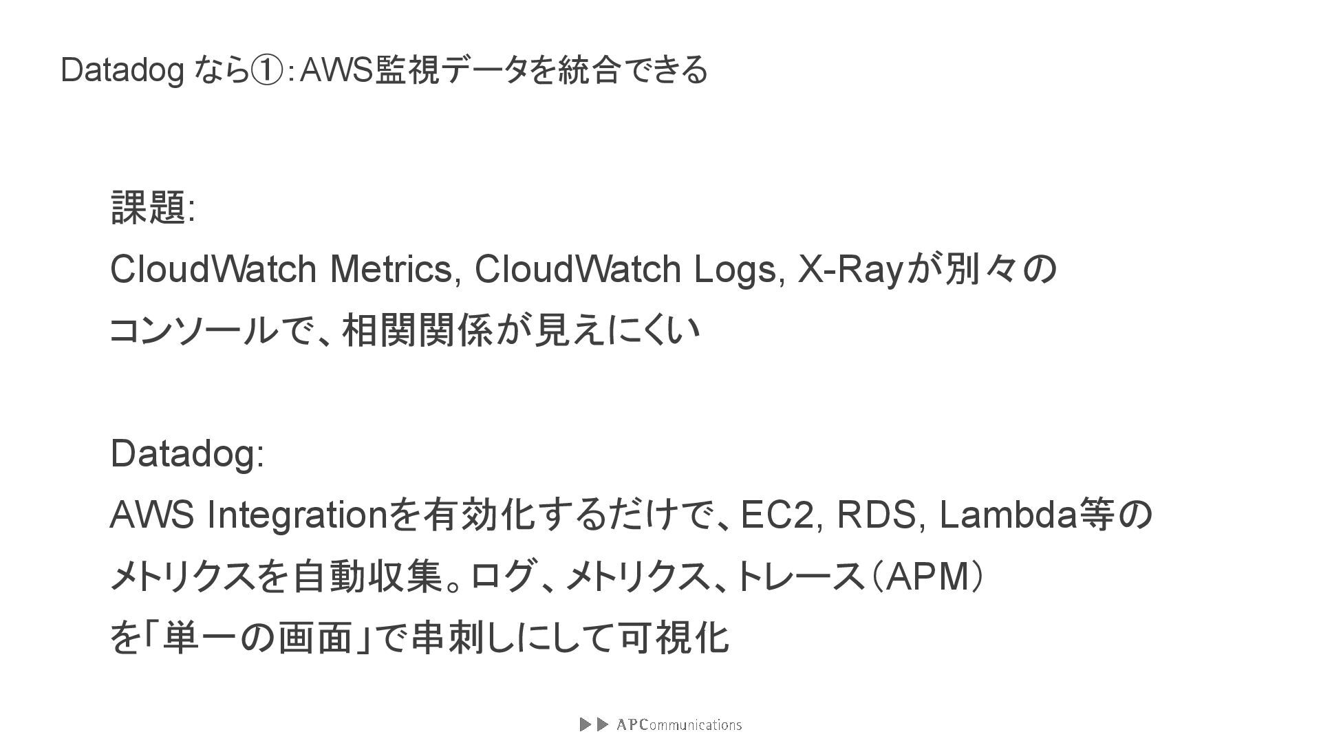 Datadog なら①:AWS監視データを統合できる 課題: CloudWatch Metrics, CloudWatch Logs, X-Rayが別々の コンソールで、相関関係が見えにくい Datadog: