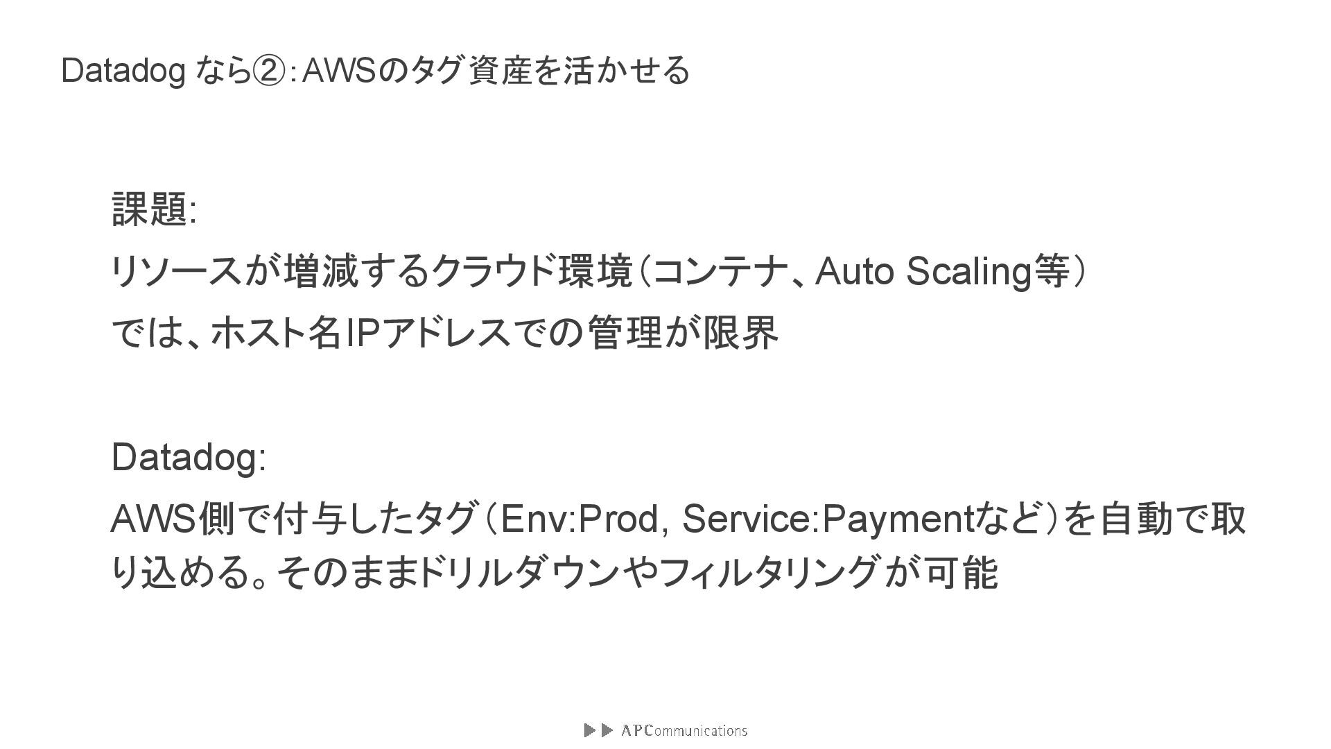 Datadog なら②:AWSのタグ資産を活かせる 課題: リソースが増減するクラウド環境(コンテナ、Auto Scaling等) では、ホスト名IPアドレスでの管理が限界 Datadog: AWS側で付与したタグ(Env:Prod, Service:Paymentなど)を自動で取 り込める。そのままドリルダウンやフィルタリングが可能