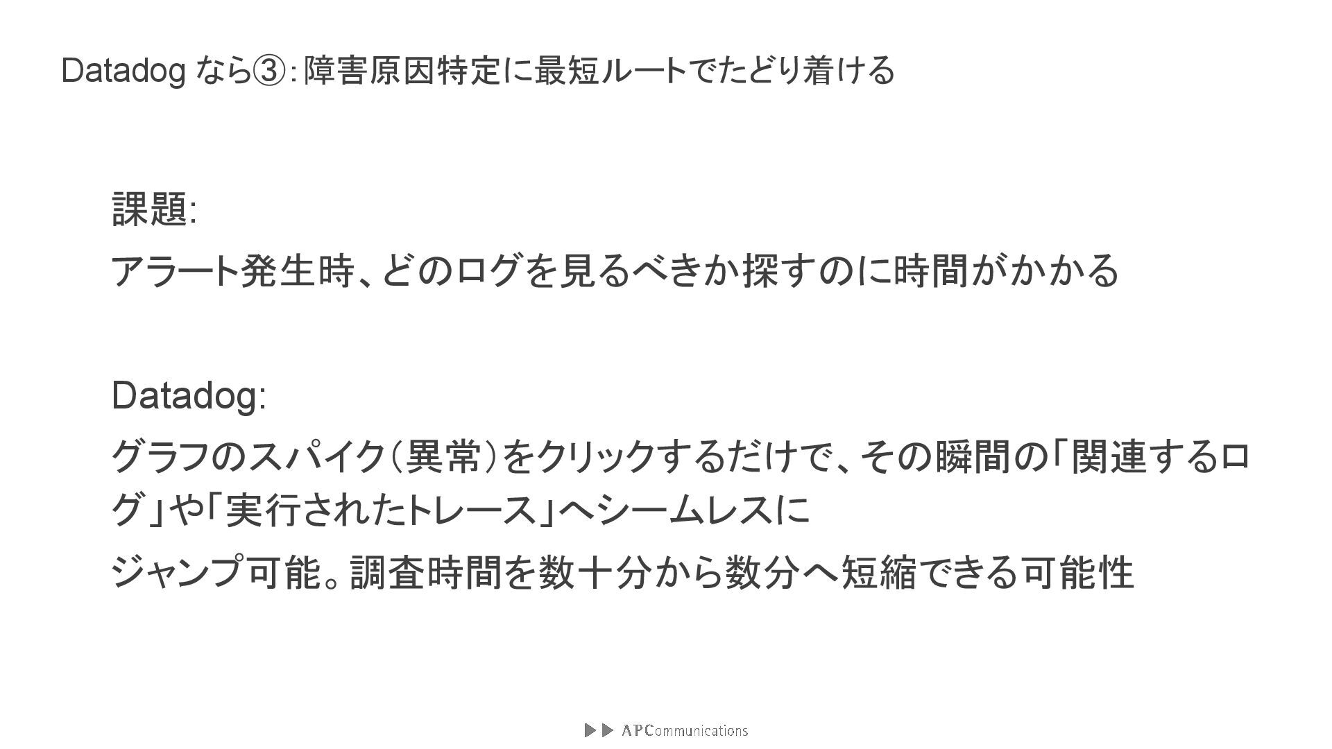 Datadog なら③:障害原因特定に最短ルートでたどり着ける 課題: アラート発生時、どのログを見るべきか探すのに時間がかかる Datadog: グラフのスパイク(異常)をクリックするだけで、その瞬間の「関連するロ グ」や「実行されたトレース」へシームレスに ジャンプ可能。調査時間を数十分から数分へ短縮できる可能性