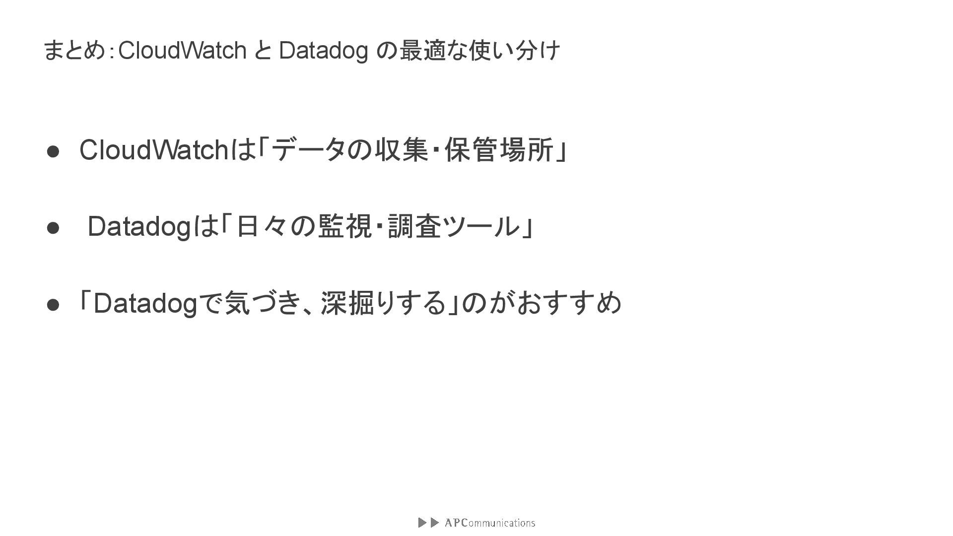 まとめ:CloudWatch と Datadog の最適な使い分け • CloudWatchは「データの収集・保管場所」 • Datadogは「日々の監視・調査ツール」 • 「Datadogで気づき、深掘りする」のがおすすめ