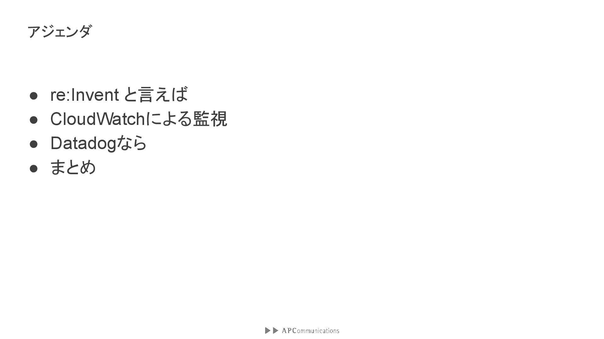 アジェンダ • re:Invent と言えば • CloudWatchによる監視 • Datadogなら • まとめ