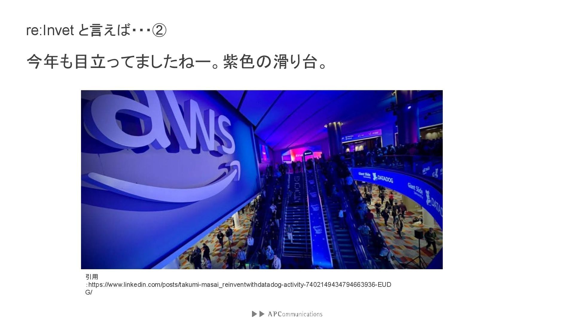 re:Invet と言えば・・・② 今年も目立ってましたねー。紫色の滑り台。 引用 :https://www.linkedin.com/posts/takumi-masai_reinventwithdatadog-activity-7402149434794663936-EUD G/