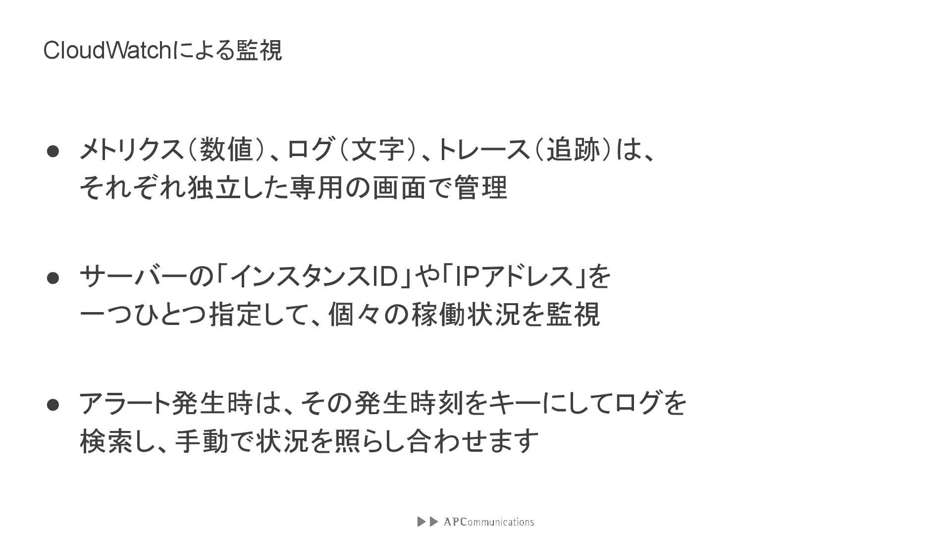 CloudWatchによる監視 • メトリクス(数値)、ログ(文字)、トレース(追跡)は、 それぞれ独立した専用の画面で管理 • サーバーの「インスタンスID」や「IPアドレス」を 一つひとつ指定して、個々の稼働状況を監視 • アラート発生時は、その発生時刻をキーにしてログを 検索し、手動で状況を照らし合わせます