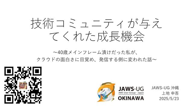 技術コミュニティが与え てくれた成長機会 ~40歳メインフレーム漬けだった私が、 クラウドの面白さに目覚め、発信する側に変われた話~ JAWS-UG 沖縄 上地 申吾 2025/5/23