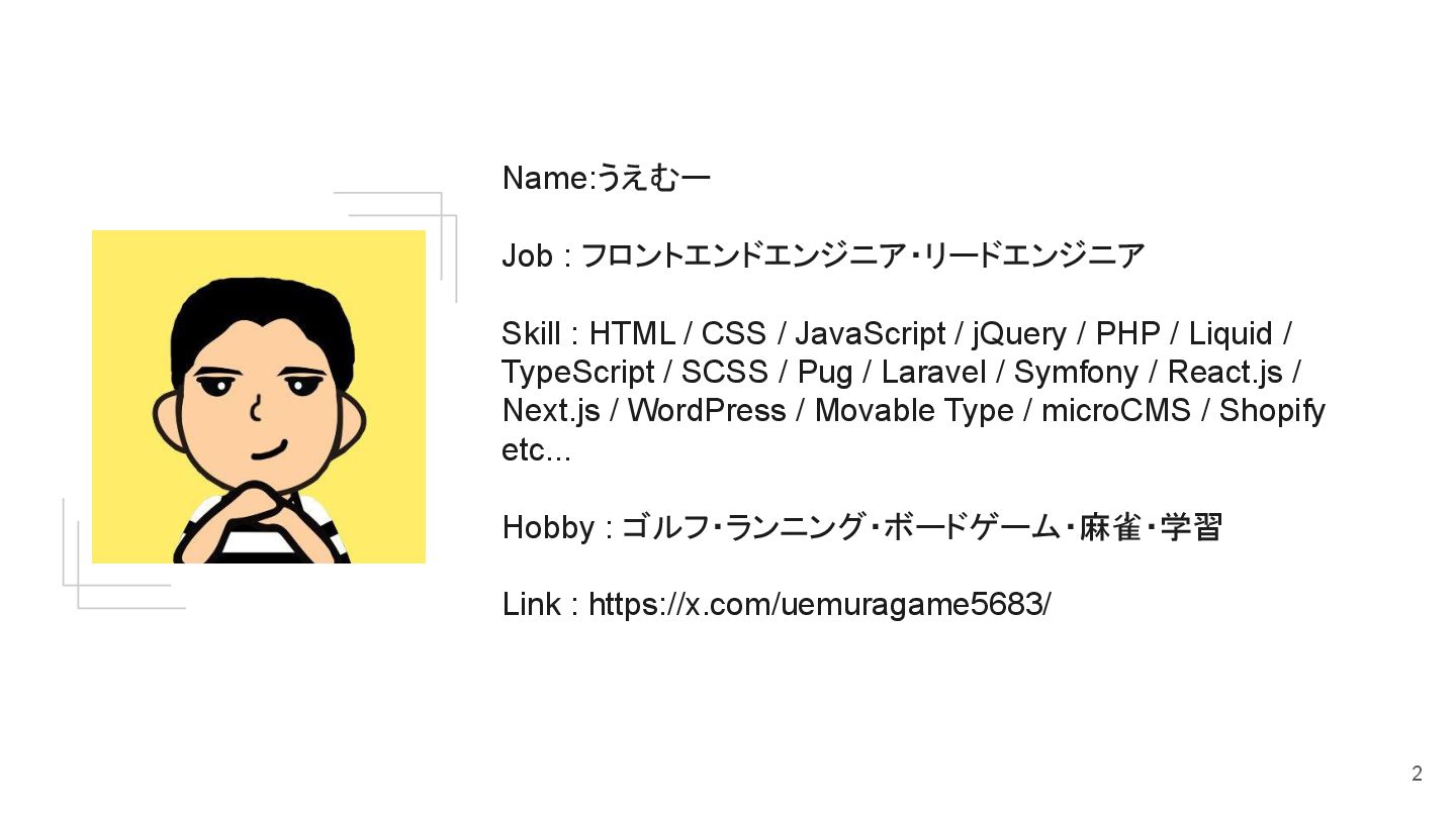 Name:うえむー Job : フロントエンドエンジニア・リードエンジニア Skill : HTML / CSS /