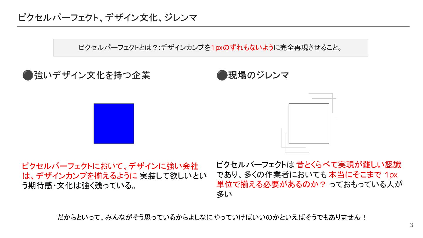 3 ピクセルパーフェクトとは?:デザインカンプを1pxのずれもないように完全再現させること。 だからといって、みんながそう思っているからよしなにやっていけばいいのかといえばそうでもありません! ⚫強いデザイン文化を持つ企業 ピクセルパーフェクトにおいて、デザインに強い会社 は、デザインカンプを揃えるように 実装して欲しいとい う期待感・文化は強く残っている。