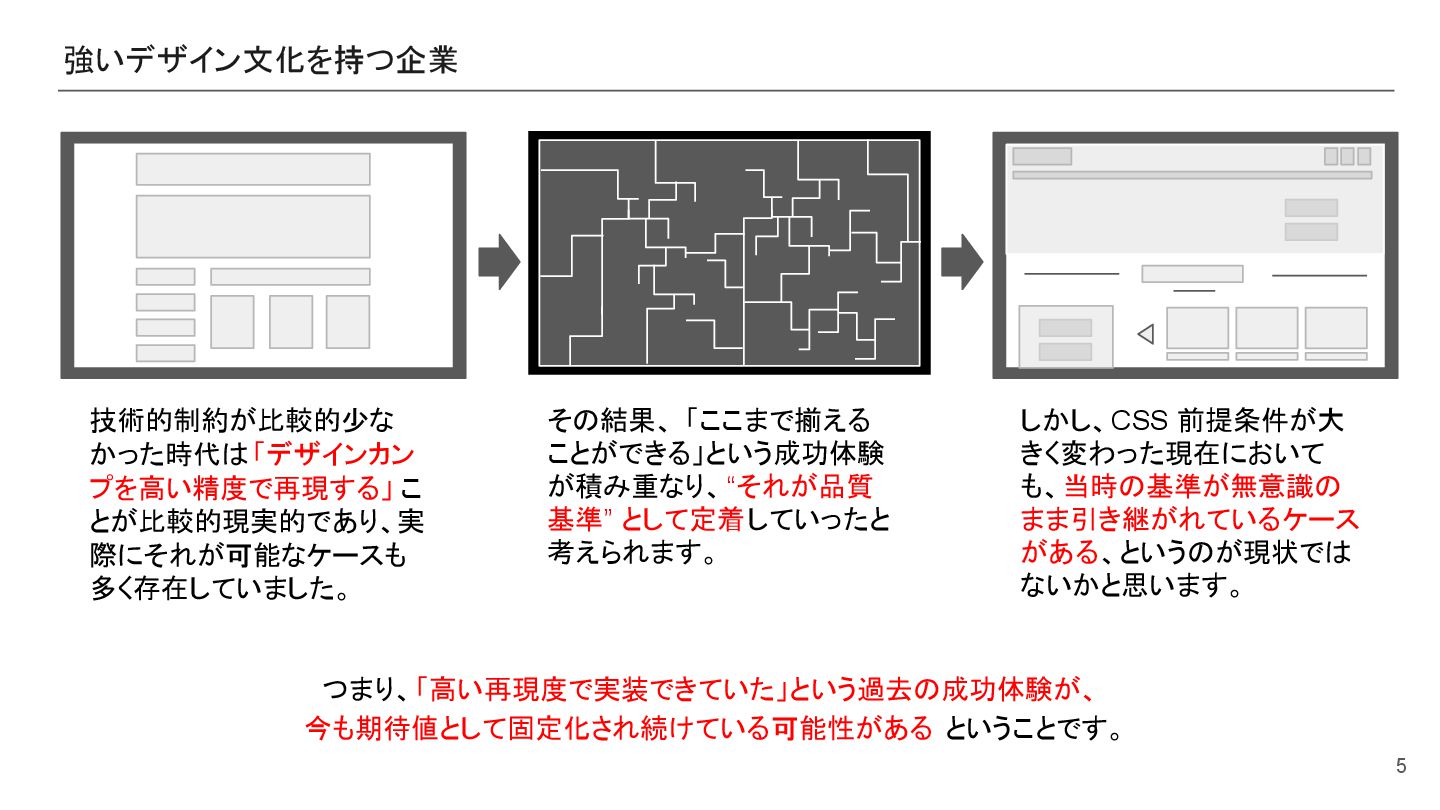 今も期待値として固定化され続けている可能性がある ということです。 その結果、 「ここまで揃える ことができる」という成功体験 が積み重なり、“それが品質 基準” として定着していったと 考えられます。 しかし、CSS 前提条件が大 きく変わった現在において も、当時の基準が無意識の まま引き継がれているケース がある、というのが現状では ないかと思います。