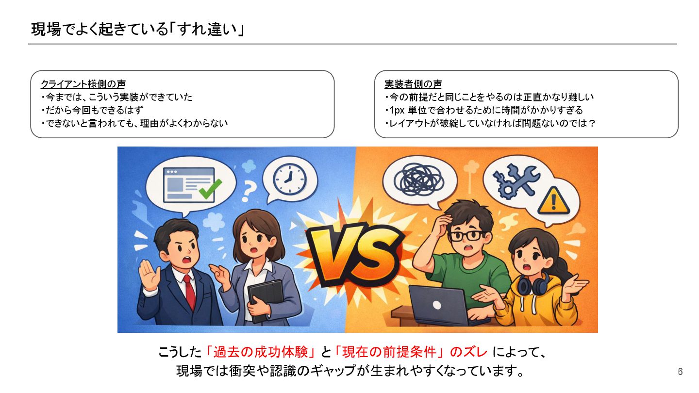 現場でよく起きている「すれ違い」 6 こうした 「過去の成功体験」 と 「現在の前提条件」 のズレ によって、 現場では衝突や認識のギャップが生まれやすくなっています。 実装者側の声