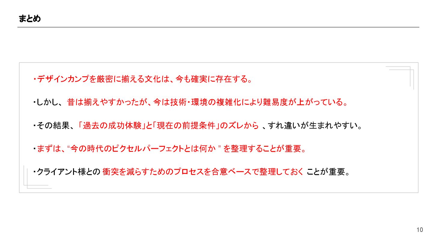 まとめ 10 ・デザインカンプを厳密に揃える文化は、今も確実に存在する。 ・しかし、 昔は揃えやすかったが、今は技術・環境の複雑化により難易度が上がっている。 ・その結果、 「過去の成功体験」と「現在の前提条件」のズレから 、すれ違いが生まれやすい。 ・まずは、“今の時代のピクセルパーフェクトとは何か ”