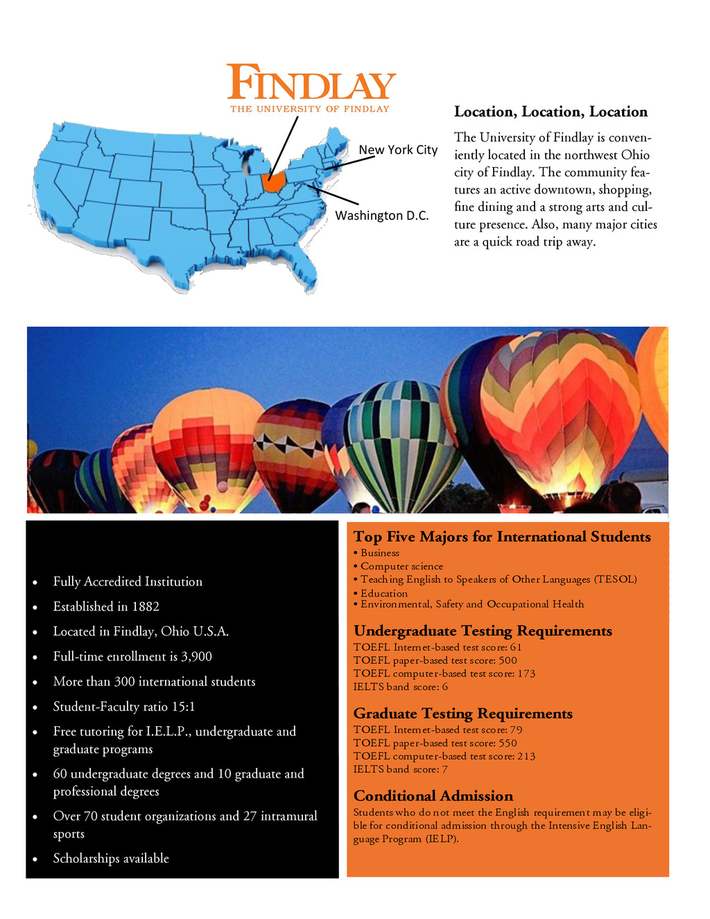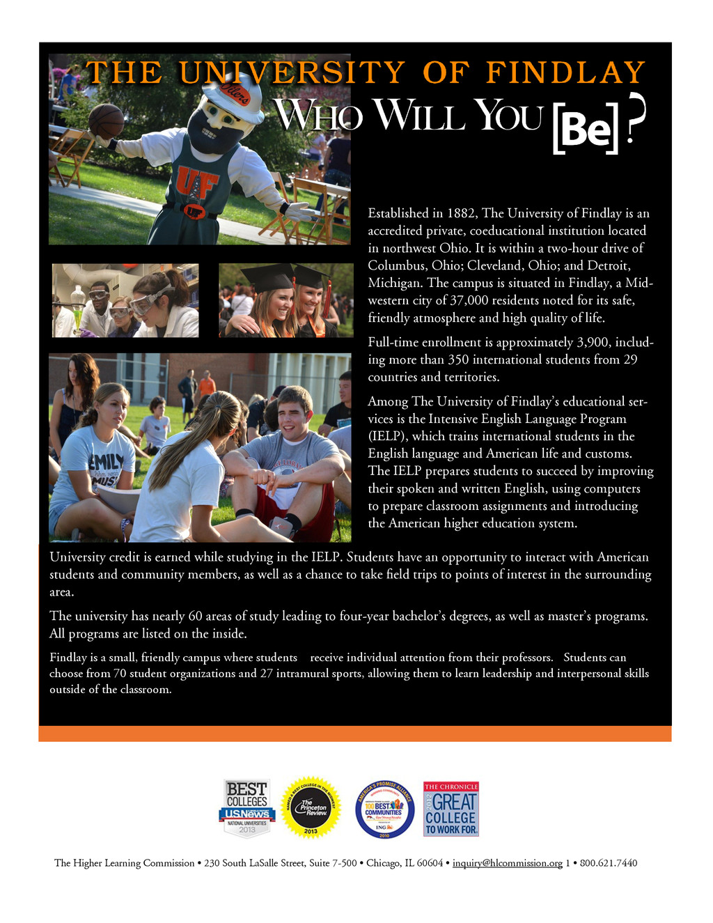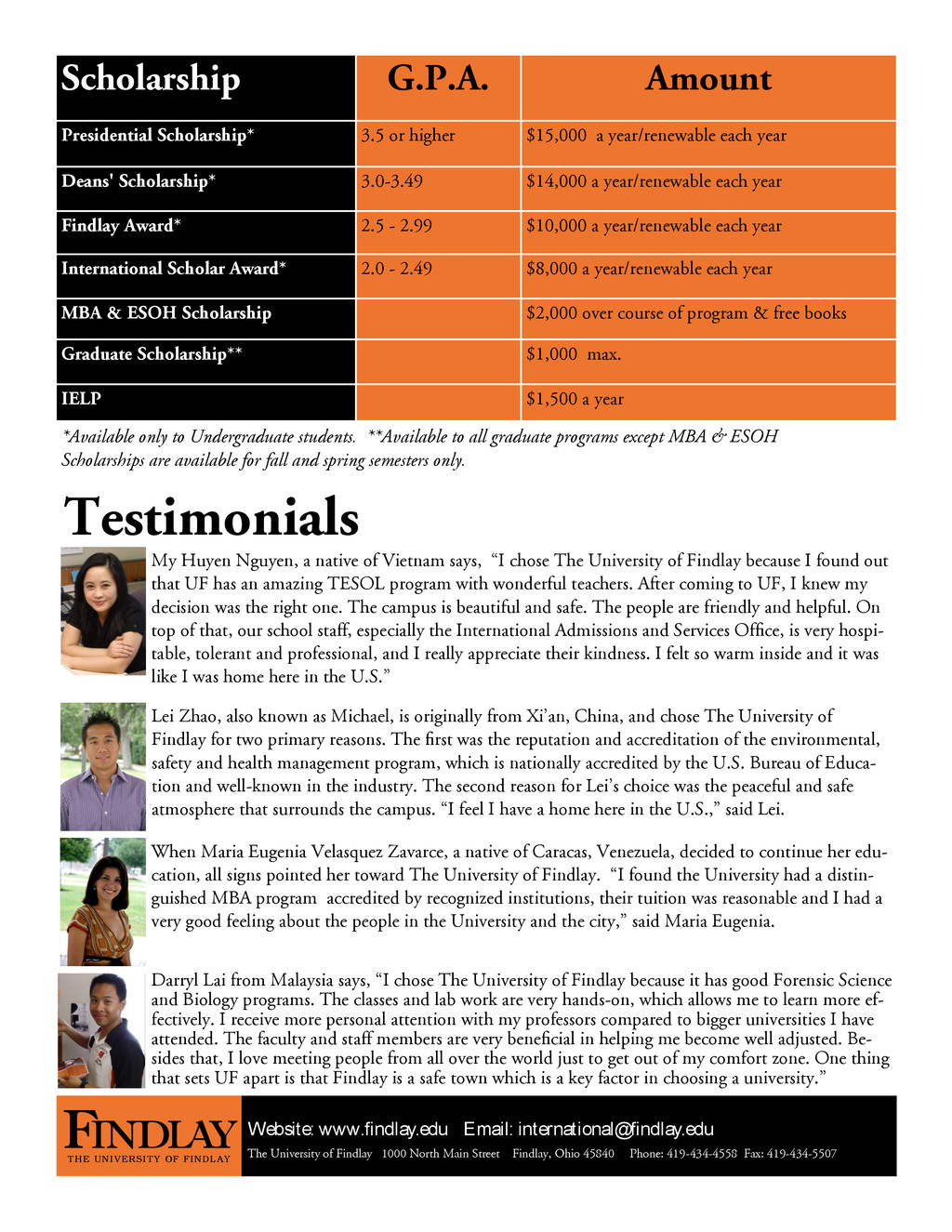 China, and chose The University of Findlay for two primary reasons. The first was the reputation and accreditation of the environmental, safety and health management program, which is nationally accredited by the U.S. Bureau of Educa- tion and well-known in the industry. The second reason for Lei’s choice was the peaceful and safe atmosphere that surrounds the campus. “I feel I have a home here in the U.S.,” said Lei. My Huyen Nguyen, a native of Vietnam says, “I chose The University of Findlay because I found out that UF has an amazing TESOL program with wonderful teachers. After coming to UF, I knew my decision was the right one. The campus is beautiful and safe. The people are friendly and helpful. On top of that, our school staff, especially the International Admissions and Services Office, is very hospi- table, tolerant and professional, and I really appreciate their kindness. I felt so warm inside and it was like I was home here in the U.S.” When Maria Eugenia Velasquez Zavarce, a native of Caracas, Venezuela, decided to continue her edu- cation, all signs pointed her toward The University of Findlay. “I found the University had a distin- guished MBA program accredited by recognized institutions, their tuition was reasonable and I had a very good feeling about the people in the University and the city,” said Maria Eugenia. Darryl Lai from Malaysia says, “I chose The University of Findlay because it has good Forensic Science and Biology programs. The classes and lab work are very hands-on, which allows me to learn more ef- fectively. I receive more personal attention with my professors compared to bigger universities I have attended. The faculty and staff members are very beneficial in helping me become well adjusted. Be- sides that, I love meeting people from all over the world just to get out of my comfort zone. One thing that sets UF apart is that Findlay is a safe town which is a key factor in choosing a university.” ch h .P. . Presidential Scholarship* 3.5 or higher $15,000 a year/renewable each year Deans' Scholarship* 3.0-3.49 $14,000 a year/renewable each year y w * 2.5 - 2.99 $10 000 / w b ch w * 2.0 - 2.49 $8 000 / w b B & E OH ch h $2 000 & b Graduate Scholarship** $1 000 x. ELP $1,500 a year *Available only to Undergraduate students. **Available to all graduate programs except MBA & ESOH Scholarships are available for fall and spring semesters only. Website: www.findlay.edu Email: